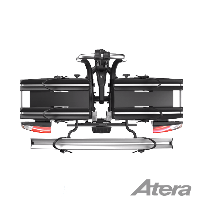- L'Atera Genio PRO, con il suo esclusivo meccanismo di chiusura, ha perfezionato un portabici compatto per il trasporto sicuro delle biciclette. L'innovazione risiede nella rotazione delle ali laterali. Una volta ripiegate, si ripiegano verso l'interno, proteggendo le luci e dirigendo il lato trasparente delle ali verso l'esterno. È possibile fissare un ulteriore binario per bici (adattatore) con grandi viti ad alette, senza bisogno di attrezzi.