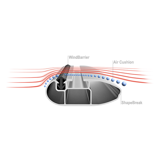 Inoltre, WindBarrier crea piccoli vortici, creando un cuscinetto d'aria sulla superficie della traversa, che funge da ponte per il flusso d'aria sopra la fessura a T, prevenendo il rumore in tutte le condizioni di guida. Anche a veicolo scarico, non è necessario coprire la fessura per prevenire il rumore.