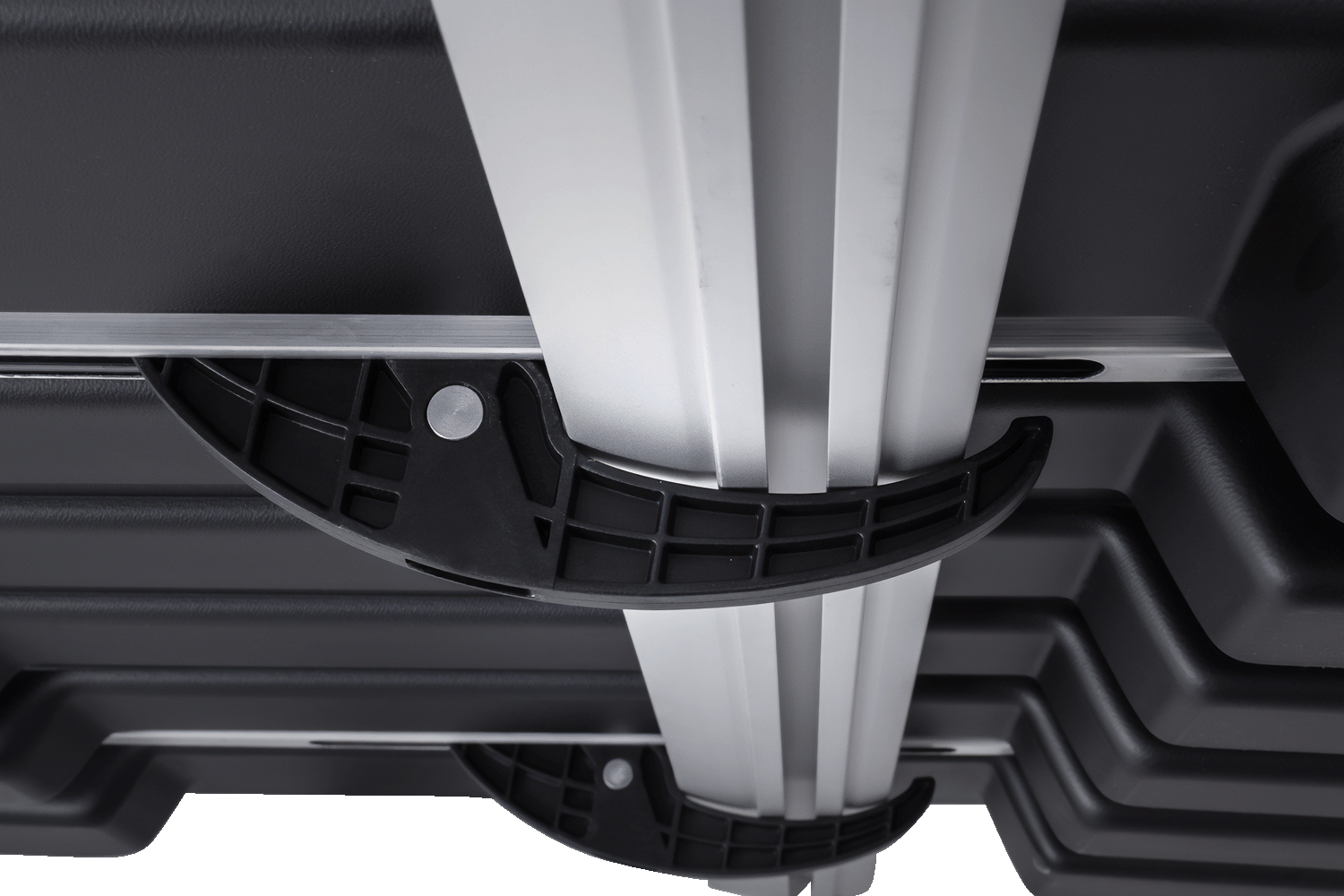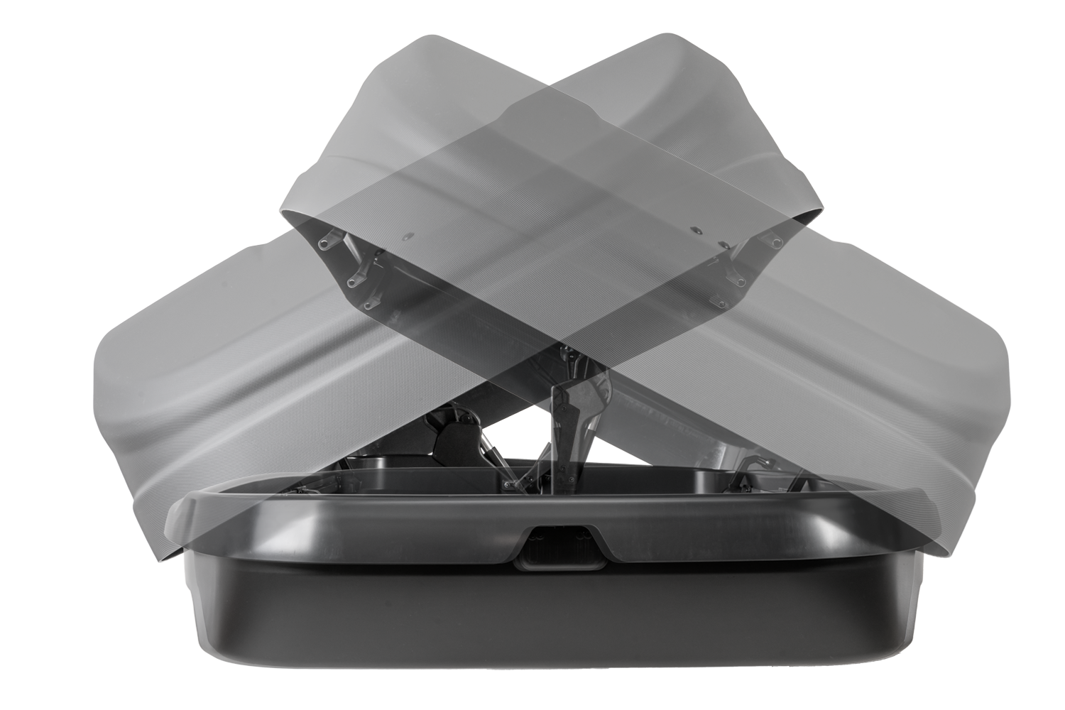 La struttura è realizzata in plastica ABS resistente ai raggi UV e alle intemperie, garantendo durata e longevità. Con un peso di 16 kg, il box offre una capacità di carico massima di 75 kg . La base è rinforzata con strisce metalliche per una maggiore rigidità e l'apertura bidirezionale consente un comodo carico da entrambi i lati del veicolo. Un sistema di chiusura centralizzata a tre punti e un sistema che impedisce la rimozione della chiave prima che il coperchio sia correttamente chiuso garantiscono sicurezza in ogni viaggio.
