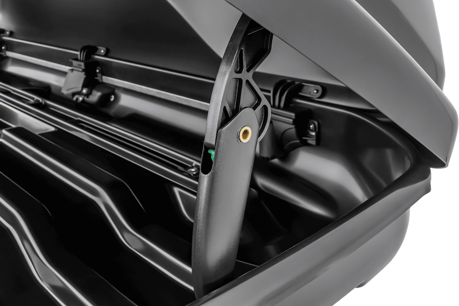 Il box è stato progettato per combinare funzionalità e design elegante . La sua copertura aerodinamica riduce la resistenza all'aria e il rumore durante la guida, migliorando il comfort di viaggio. Una capacità di carico di 75 kg con un peso di 17,5 kg garantisce un equilibrio ottimale tra durata e facilità d'uso. Il sistema di apertura bilaterale consente un rapido accesso all'interno da entrambi i lati del veicolo, il che si rivela estremamente pratico, ad esempio, nei parcheggi affollati.