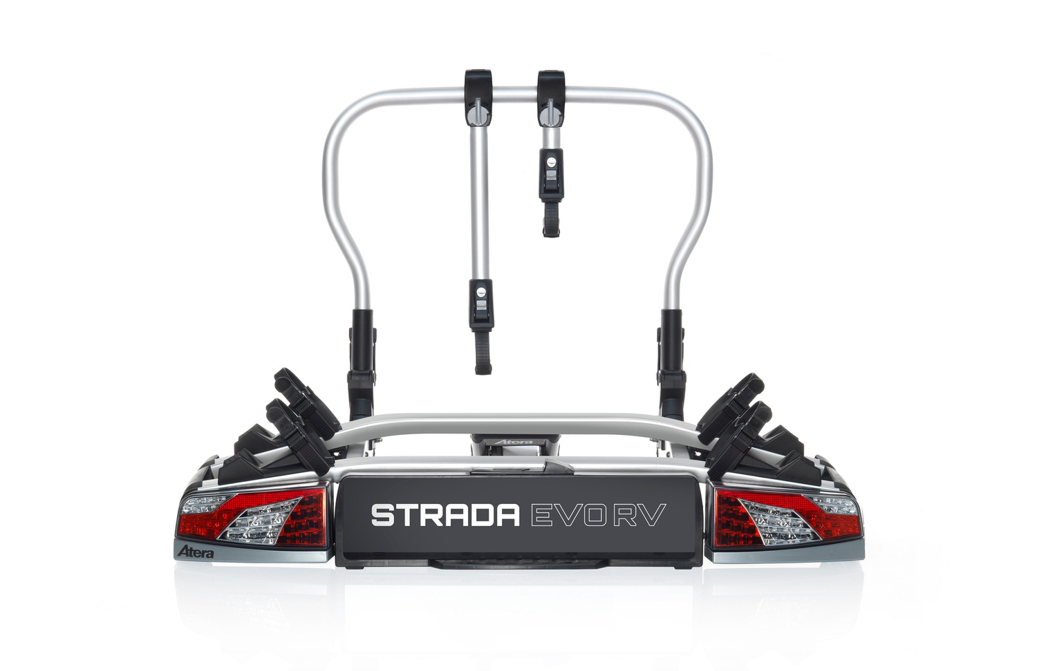 - L'Atera Strada EVO RV 2 è una piattaforma progettata per camper o altri veicoli con portellone posteriore ad apertura laterale. Le luci posteriori offrono un design moderno e un'eccellente visibilità. Può ospitare fino a tre biciclette.