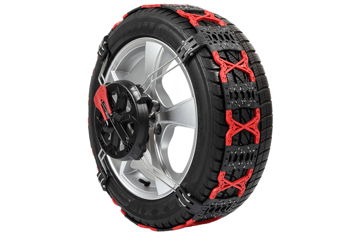 La catena, realizzata in plastica rinforzata, è disposta a nido d'ape, garantendo un'eccellente trazione sulla neve , facilitando la partenza e garantendo spazi di frenata ridotti sul ghiaccio . Lo spessore delle maglie della catena sul battistrada è di soli 7 mm.
