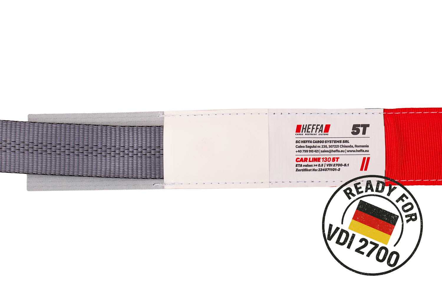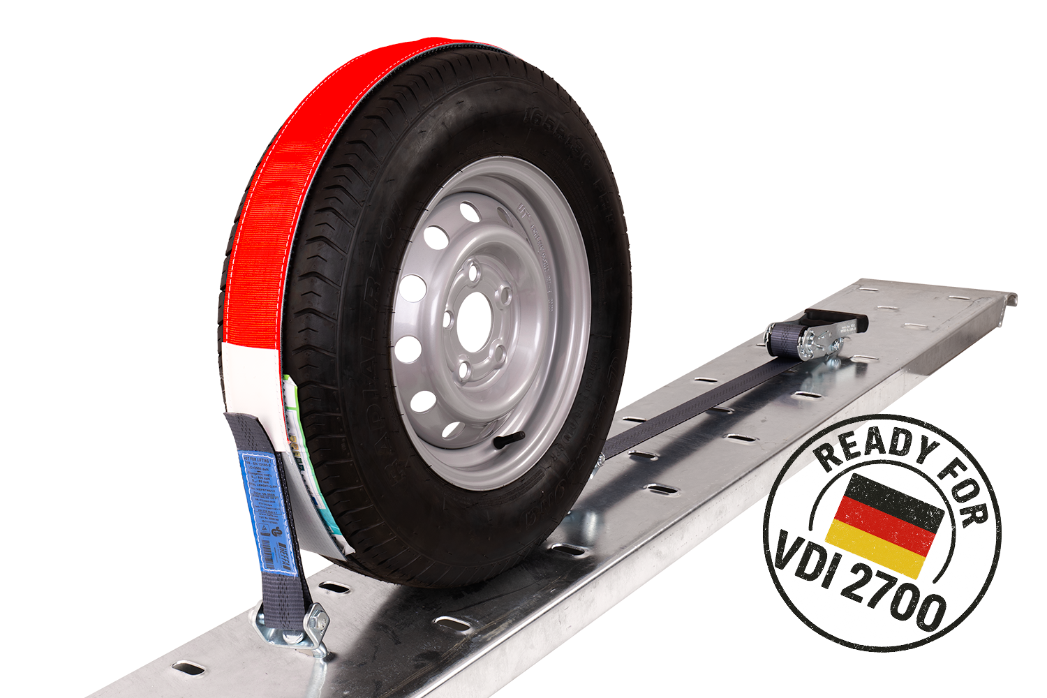 La direttiva VDI 2700 Parte 8.1 è una norma tecnica tedesca che specifica i requisiti dettagliati per il fissaggio dei veicoli trasportati su rimorchi a pianale e rimorchi . Per quanto riguarda le cinghie di ancoraggio con fissaggio su ruote, questa direttiva specifica, tra l'altro, il metodo di disposizione delle cinghie, il numero richiesto di punti di ancoraggio (ad esempio, sistema a 3 punti), i parametri minimi di forza di tensione e i principi della loro marcatura e omologazione tecnica. La conformità alla VDI 2700 8.1 significa che le cinghie soddisfano rigorosi requisiti in termini di sicurezza, affidabilità ed efficacia dell'immobilizzazione del veicolo trasportato , fattore fondamentale per il trasporto professionale di autovetture e furgoni. Grazie a ciò, l'utente può essere certo che il sistema di ancoraggio utilizzato soddisfa gli attuali standard europei e tedeschi in materia di sicurezza stradale.