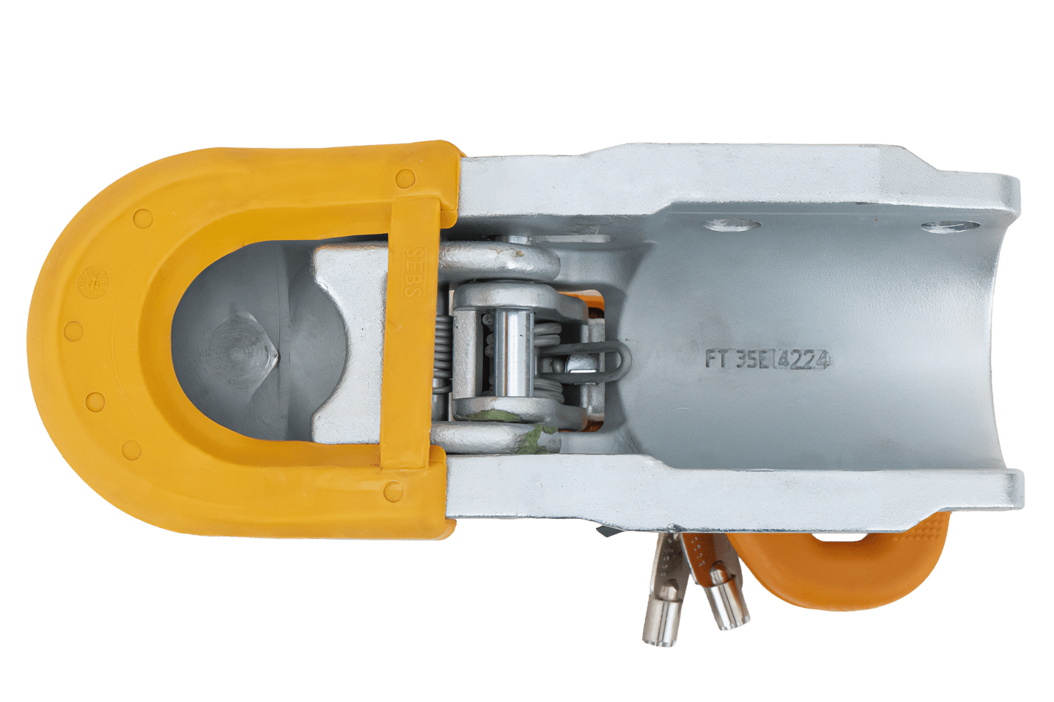 - Il gancio a sfera in ghisa BC-3500E-00-02+SD è progettato per rimorchi fino a 3.500 kg di peso. La testa di aggancio montata sulla barra di traino e il dispositivo di repulsione tubolare da 60,5 mm vengono utilizzati per collegare in sicurezza il rimorchi