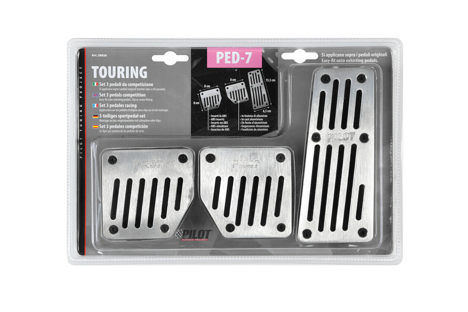 I copripedali in alluminio TOURING BLACK di LAMPA sono un modo pratico ed elegante per rinnovare gli interni della tua auto e migliorare il comfort di guida. Il set è composto da copripedali per acceleratore, freno e frizione . Realizzati in alluminio leggero e resistente con finitura nera, combinano un design elegante e sportivo con una funzionalità che si traduce in una pedalata più sicura durante la guida quotidiana e nei viaggi più lunghi.