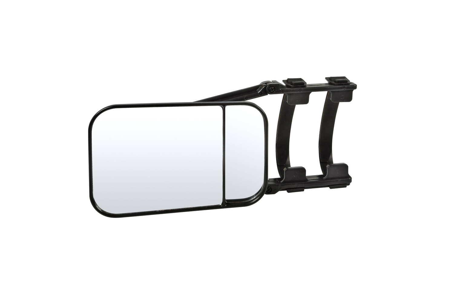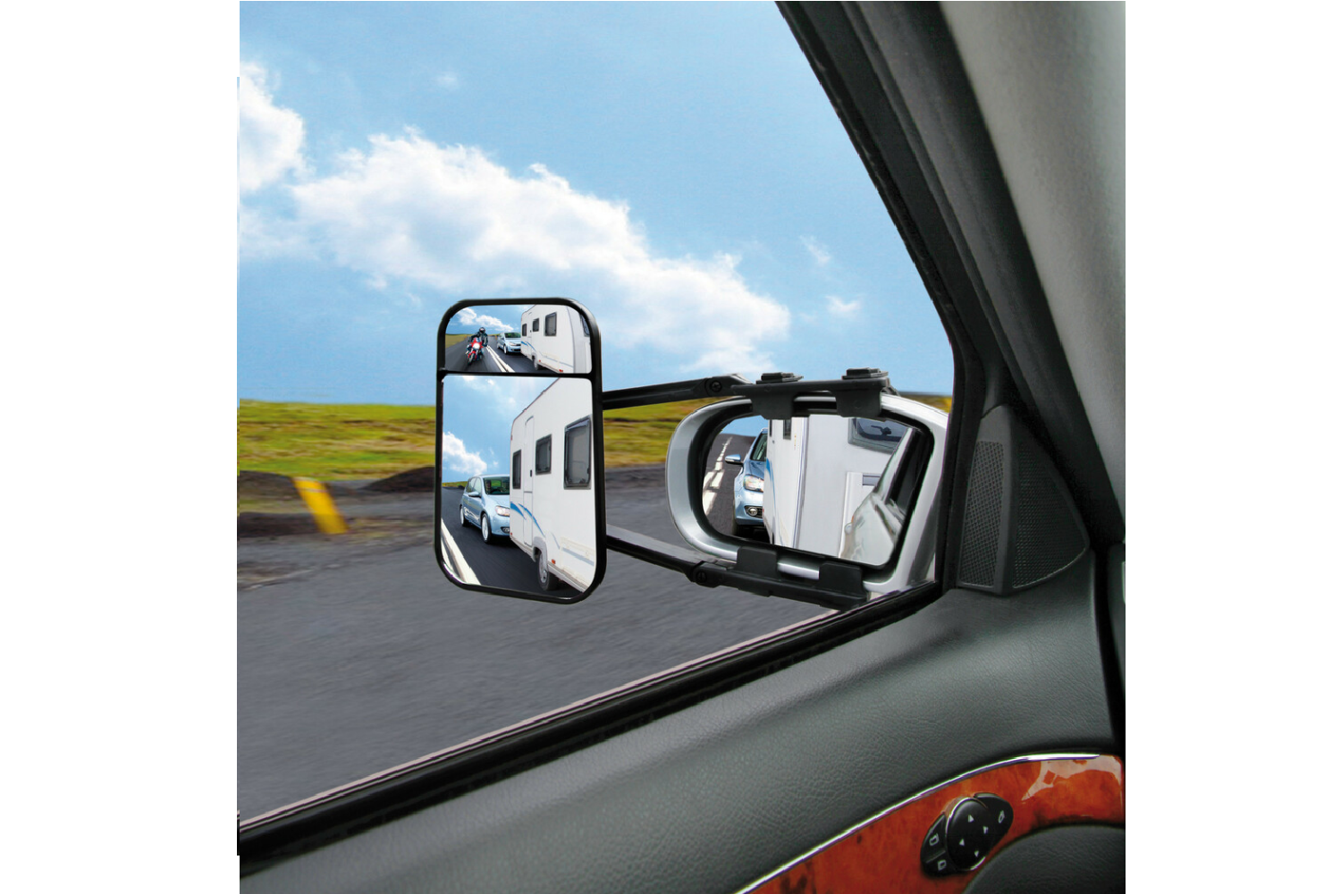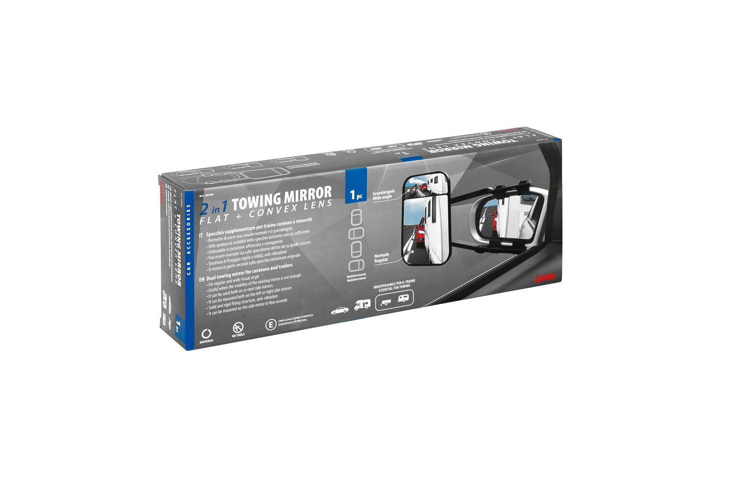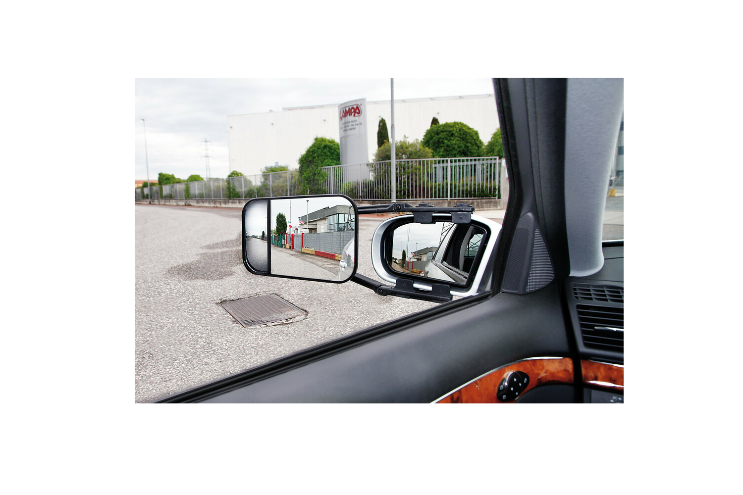 Lo specchietto retrovisore piatto e convesso per il traino è uno specchietto universale accessorio che si monta sullo specchietto retrovisore laterale originale . Il design a doppia lente amplia il campo visivo e la regolazione completa consente di ottenere l'angolo di visione ideale. Il sistema di montaggio a morsetto si adatta alla maggior parte degli specchietti; le cinghie a scala li mantengono saldamente in posizione e riducono le vibrazioni durante la guida. Lo specchietto è universale, il che ne consente il montaggio sul lato sinistro o destro del veicolo. Il prodotto è omologato ECE R46 .