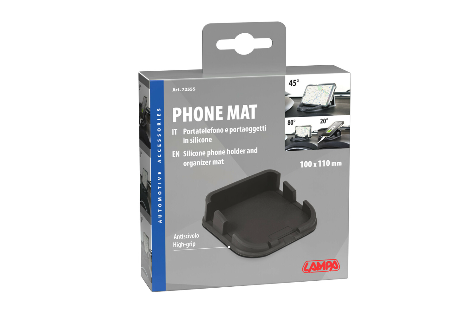- Il tappetino in silicone Phone-Mat da 110x110 mm è perfetto per riporre il telefono e piccoli oggetti come monete, chiavi e carte. È dotato di un'angolazione regolabile in 3 posizioni. Il tappetino/organizer non richiede colla ed è facile da pulire.