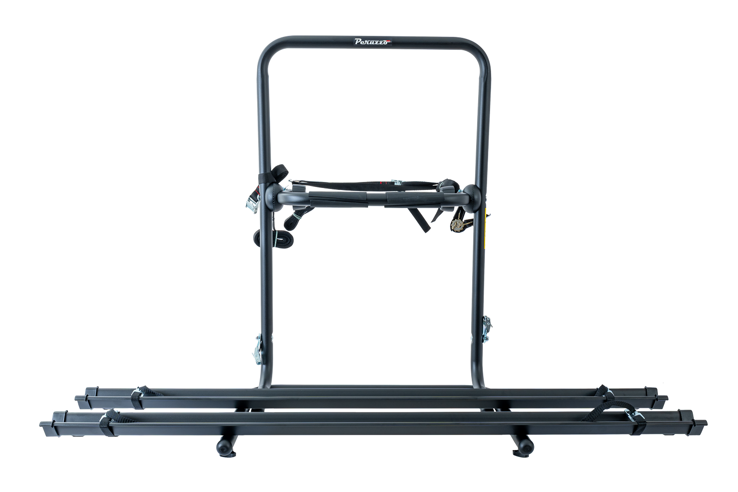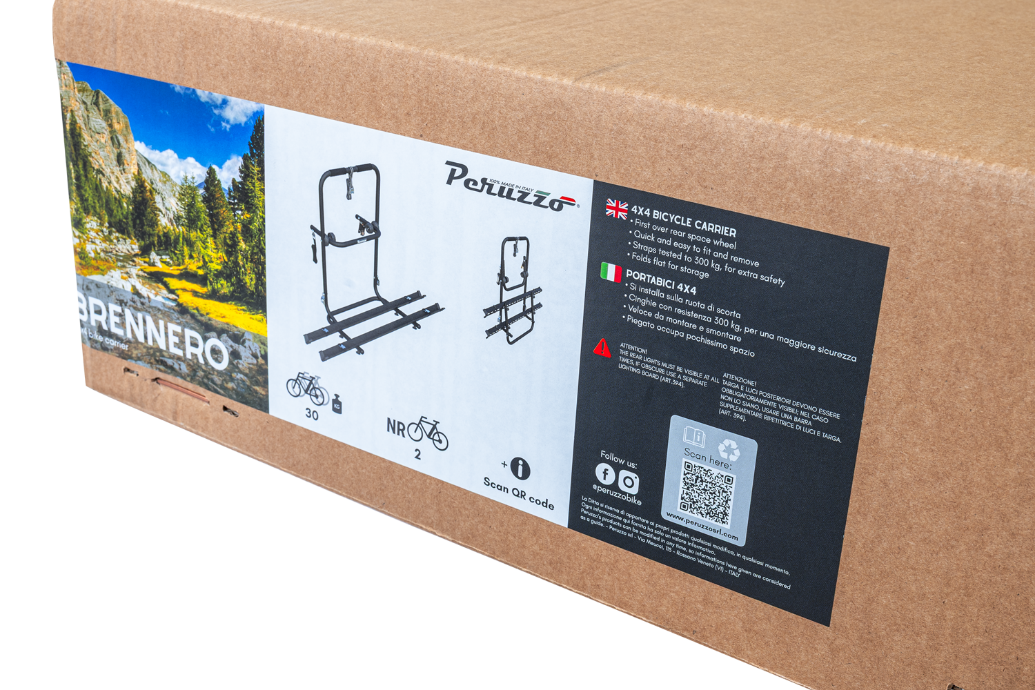 - Il portabiciclette Peruzzo Brennero 4x4, progettato per la ruota di scorta di un veicolo fuoristrada, consente il trasporto sicuro di due biciclette. È dotato di binari in alluminio leggero, telaio in acciaio resistente alla corrosione e una capacità di c