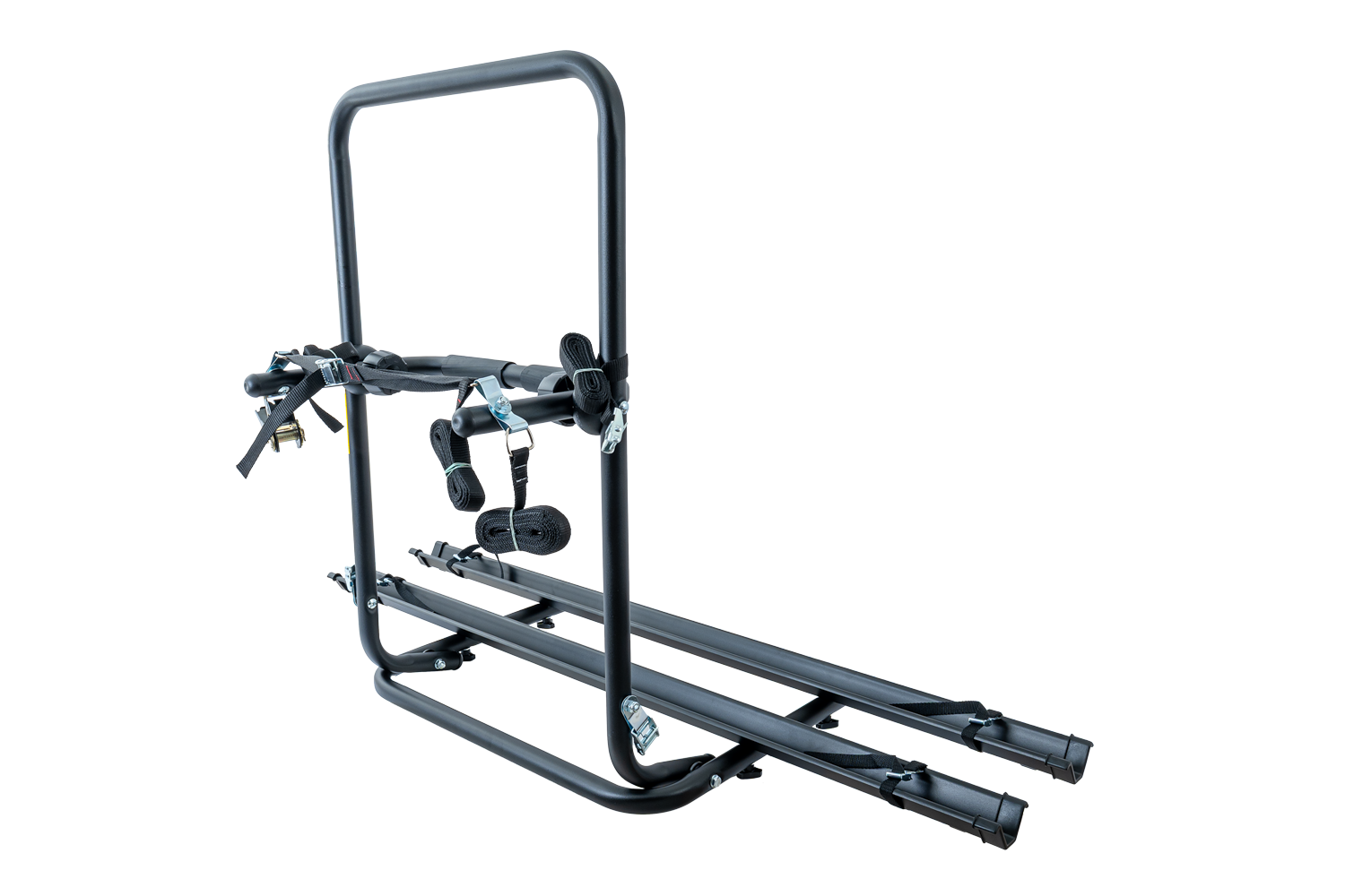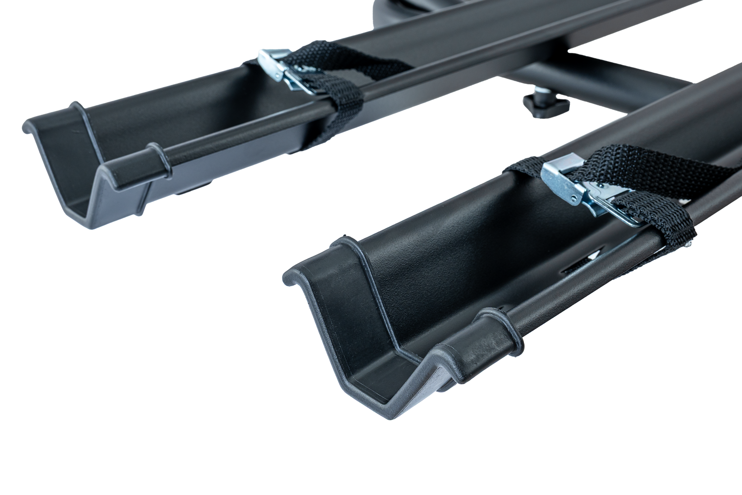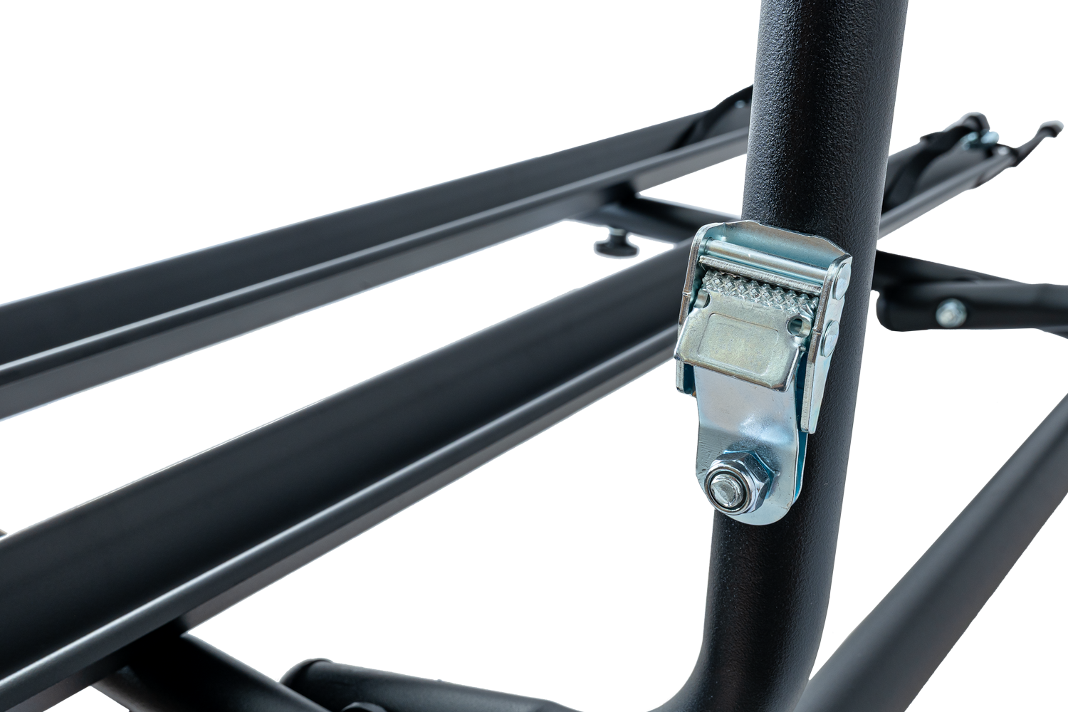 Ogni bicicletta è fissata individualmente tramite cinghie e supporti per telaio, impedendone lo spostamento anche su superfici irregolari. I binari regolabili consentono di adattare il portabici a diversi interassi, aumentando la compatibilità con diversi modelli di bicicletta. Una volta ripiegato, il portabici occupa uno spazio minimo, rendendolo facile da riporre in garage o nel bagagliaio dell'auto.