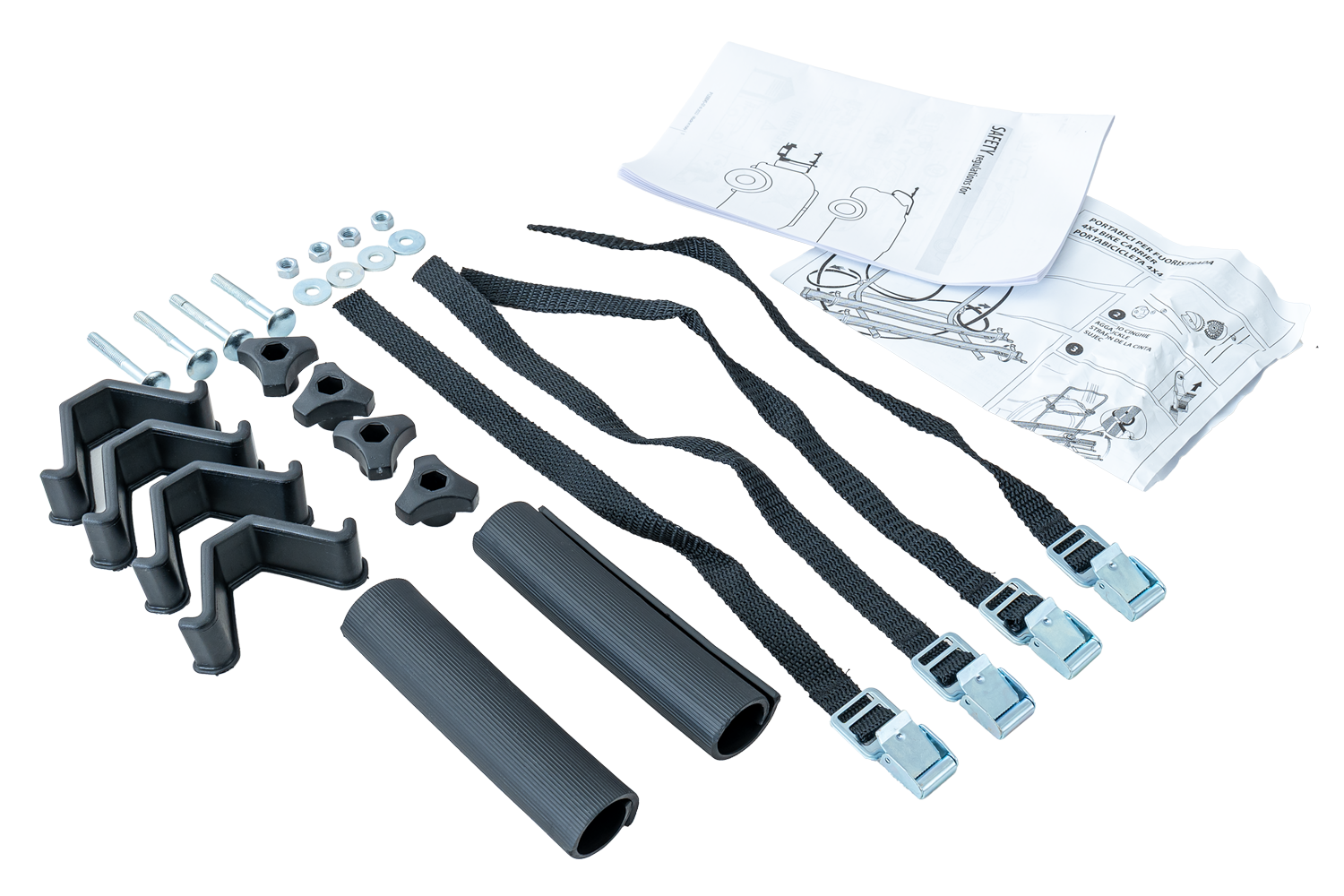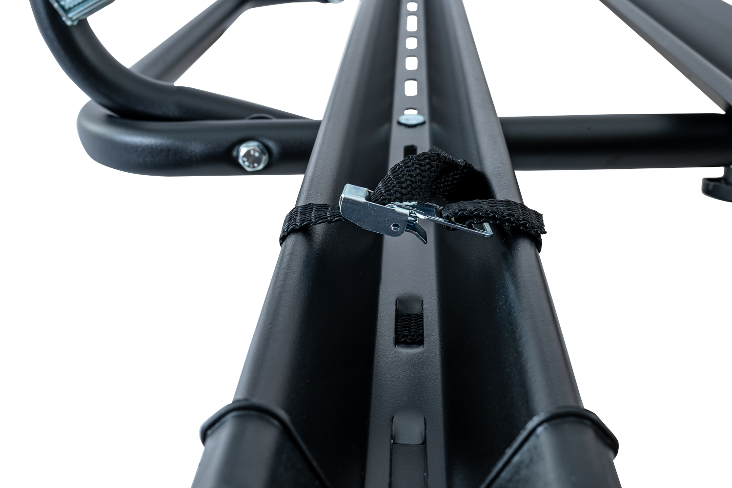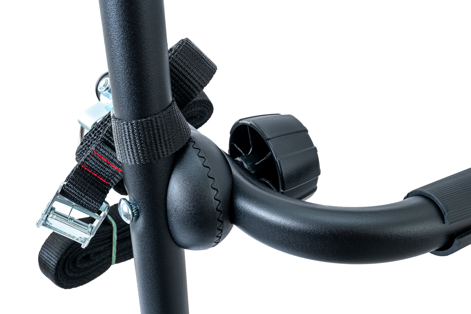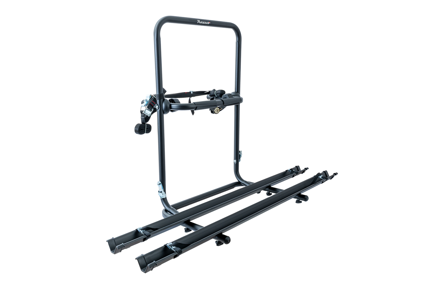 Ogni bicicletta è fissata individualmente tramite cinghie e supporti per telaio, impedendone lo spostamento anche su superfici irregolari. I binari regolabili consentono di adattare il portabici a diversi interassi, aumentando la compatibilità con diversi modelli di bicicletta. Una volta ripiegato, il portabici occupa uno spazio minimo, rendendolo facile da riporre in garage o nel bagagliaio dell'auto.