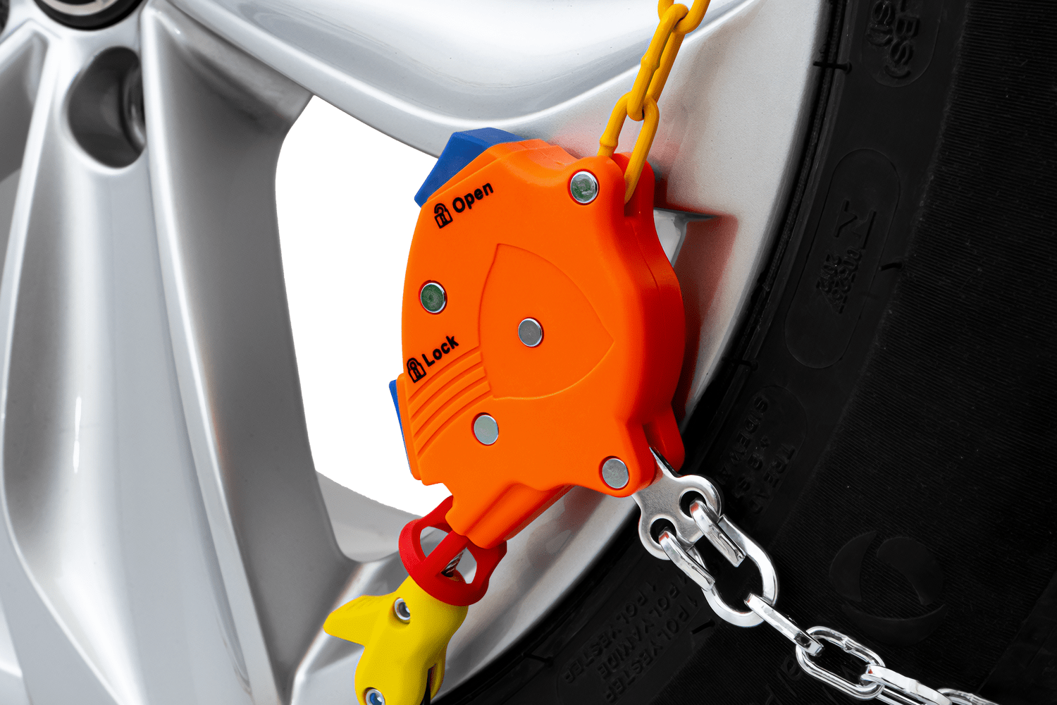 Il sistema di tensionamento automatico elimina la necessità di fermarsi per tendere le catene: la tensione si regola automaticamente durante la guida. Questo rende l'installazione e la rimozione rapide e garantisce un utilizzo confortevole anche in condizioni meteorologiche difficili.