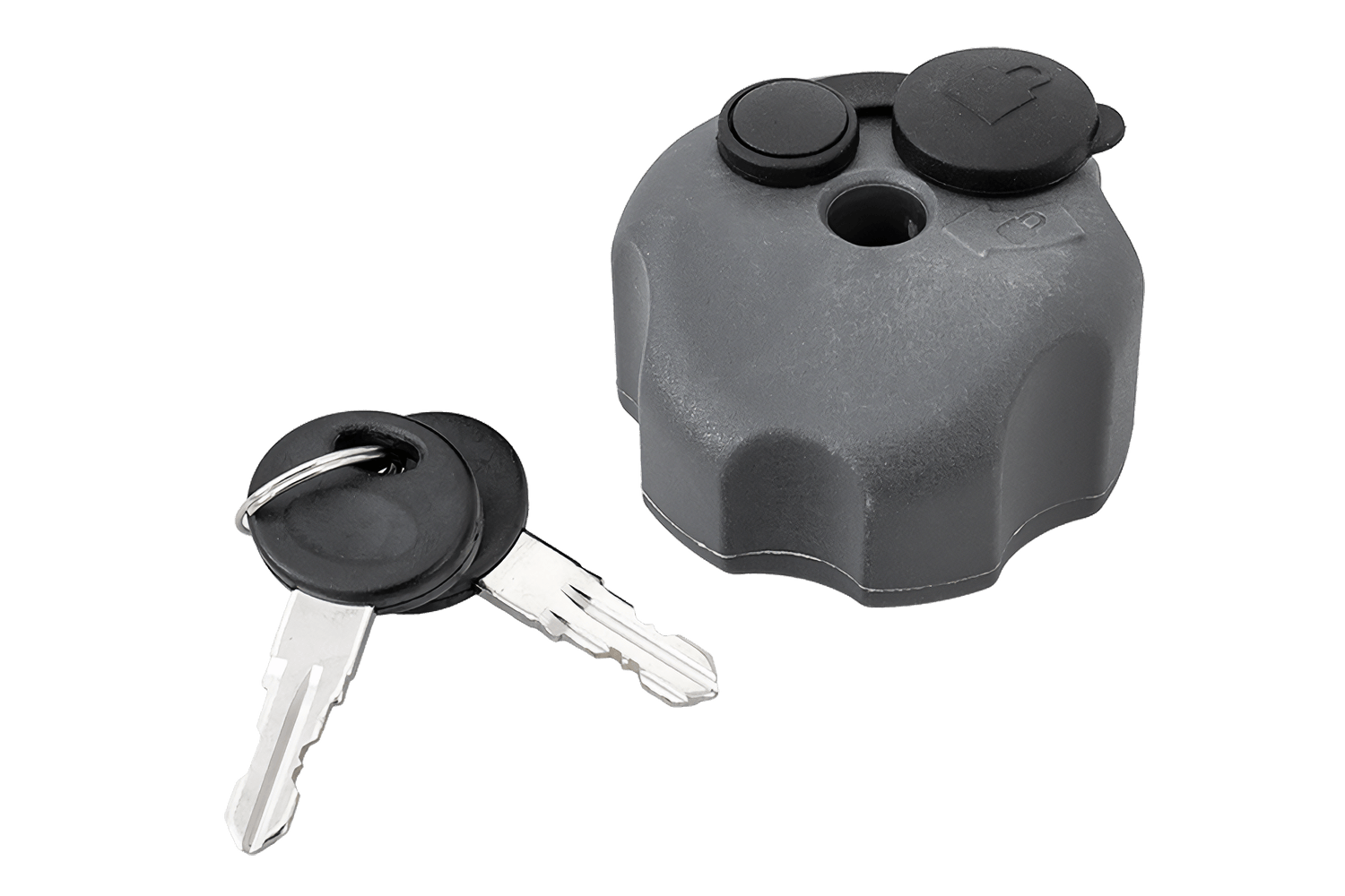 Manopola di sicurezza con chiavi e un lucchetto con lo stesso numero per il sistema di montaggio conico nelle piattaforme per bici da traino Inter Pack.