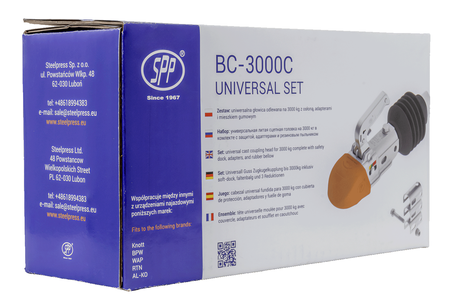 - Il gancio a sfera in ghisa BC-3000C-00-00 è progettato per rimorchi fino a 3000 kg di peso. La testa del gancio è montata su una barra di traino tubolare ed è dotata di adattatori che consentono la compatibilità con dispositivi a repulsione con tubo di sc