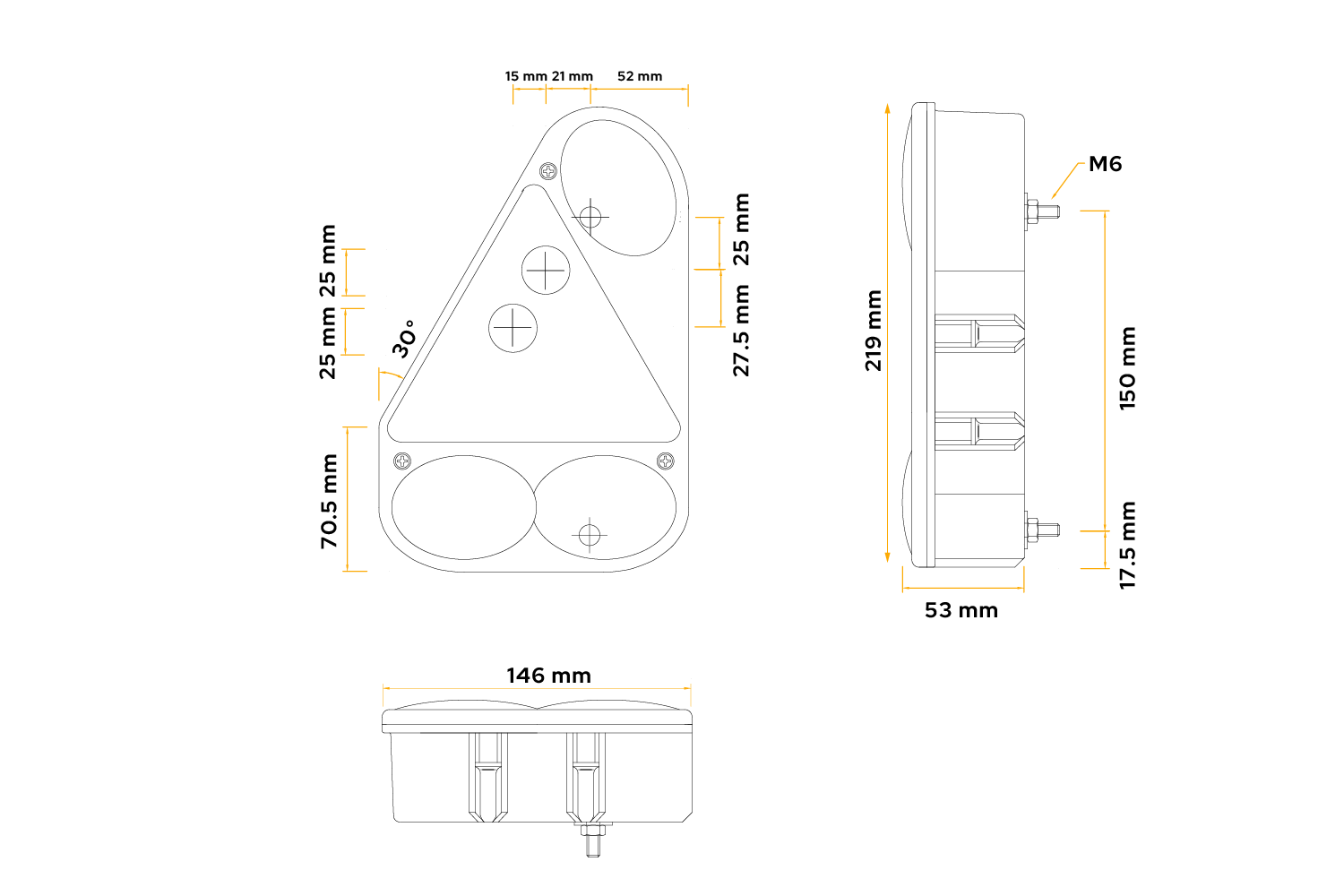 Un set di due luci posteriori EARPOINT III di ASPÖCK, progettate per l'installazione sul lato sinistro e destro del veicolo , sono larghe 146 mm , alte 219 mm e profonde 53 mm . Entrambe le luci sono dotate di connettori a baionetta a 5 pin per un'installazione rapida e semplice. in rimorchi, autobus o rimorchi .