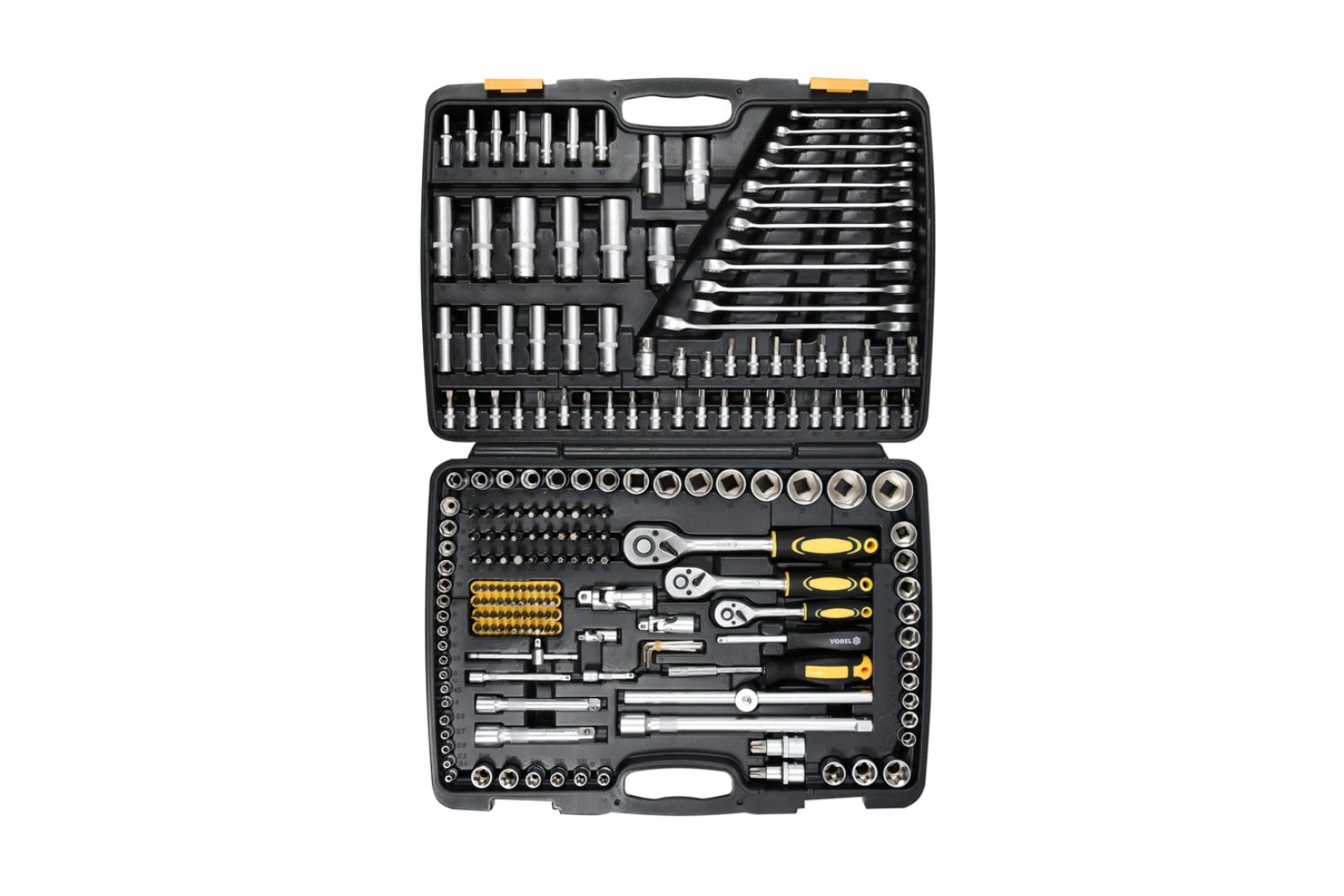 - Il set VOREL da 1/2" da 216 pezzi è un kit di utensili completo per lavori domestici e meccanici. Include un'ampia selezione di bussole e un cricchetto a 45 denti. Confezionato in una robusta valigetta, è ideale per riparazioni, assemblaggio e uso in offi