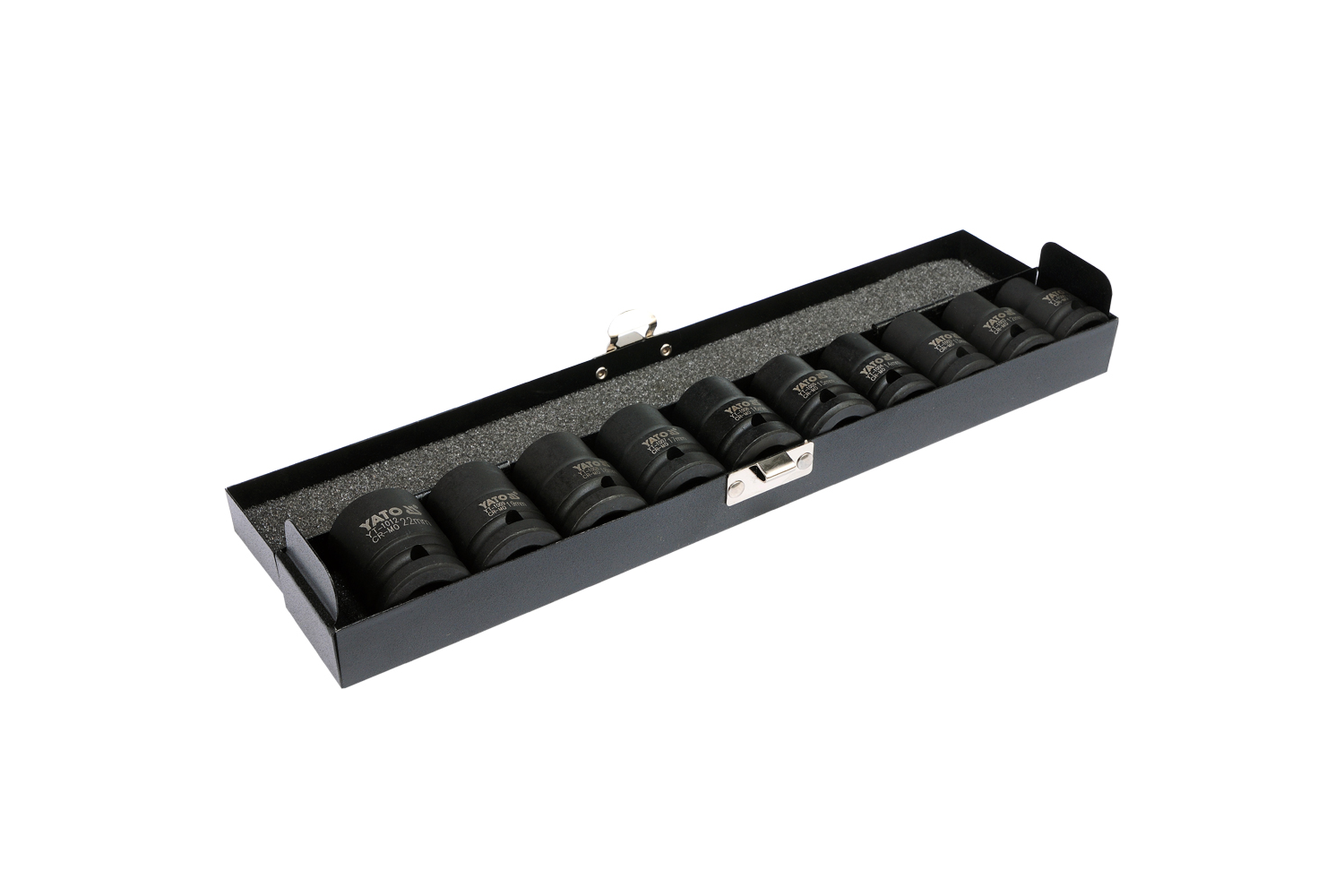 - Il set di bussole a percussione YT-1025 include 10 bussole corte da 1/2" realizzate in acciaio resistente. Il profilo esagonale e il sistema AS-DRIVE garantiscono una presa sicura e una trasmissione sicura della coppia. Ideale per lavorare con chiavi a pe