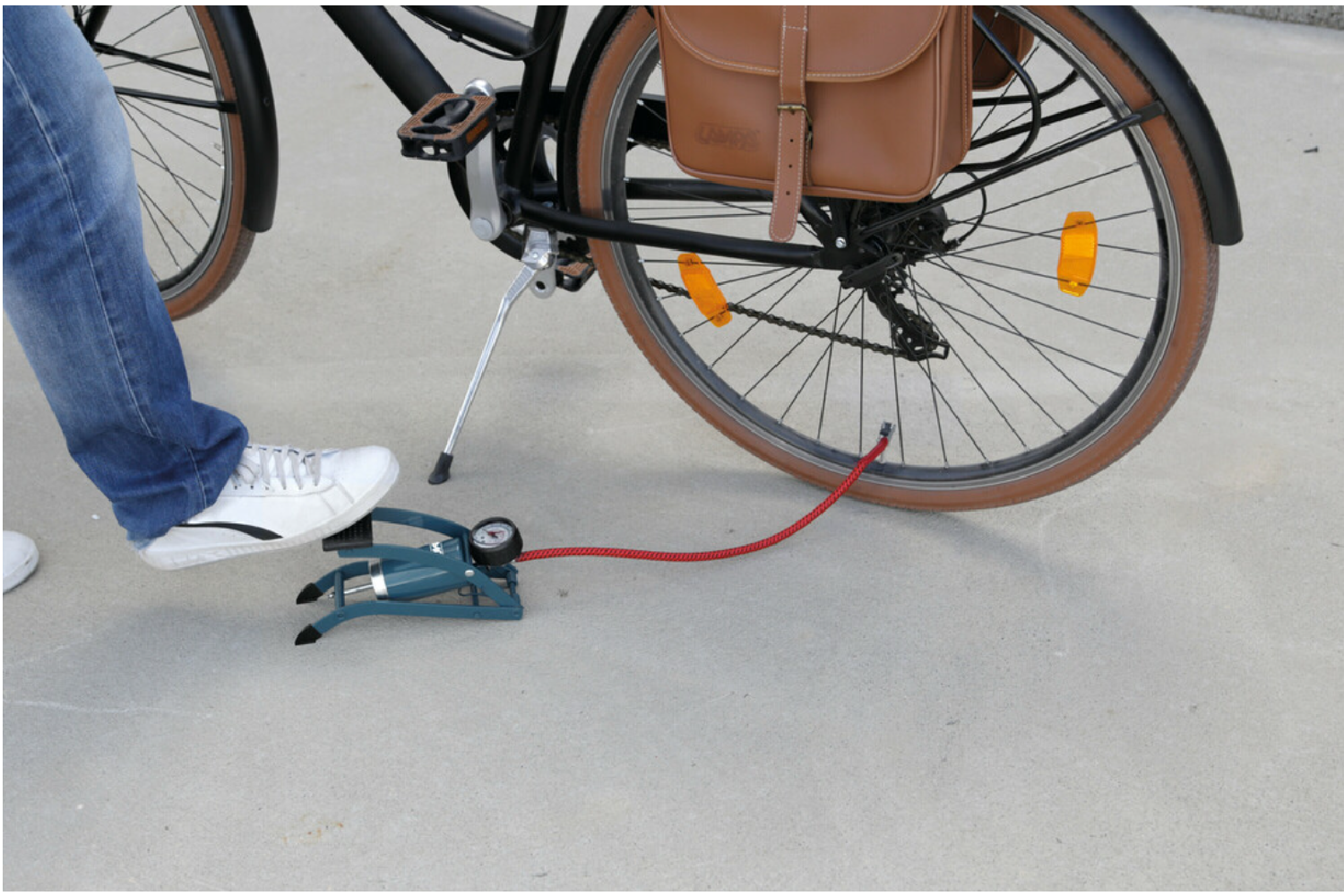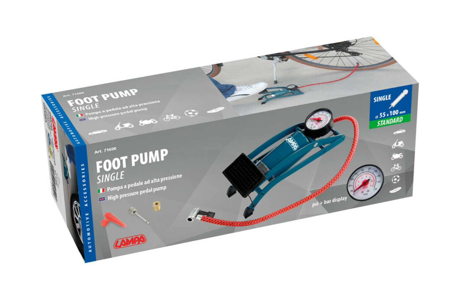 - Questa pompa a pedale monocilindrica è uno strumento resistente e versatile per gonfiare pneumatici, palloni e materassi ad aria. Il cilindro in acciaio garantisce resistenza, mentre una varietà di accessori ne amplia le possibilità di utilizzo.