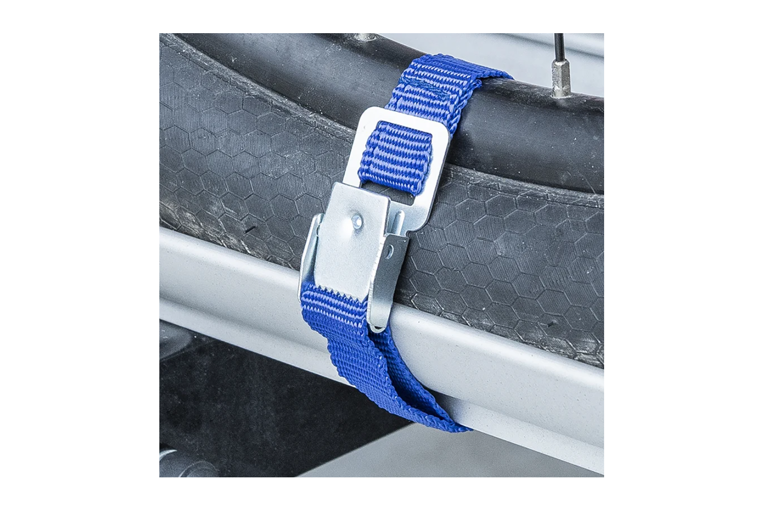 - Quattro cinghie di fissaggio con fibbia metallica fissano le ruote della bici al bagagliaio dell'auto. Garantiscono una presa sicura nelle grondaie, impedendo alla bici di spostarsi durante il trasporto.
