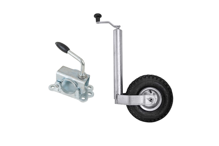 Un set KNOTT completo che include una robusta ruota di supporto, un morsetto dedicato e gli elementi di montaggio necessari , garantendo un sostegno stabile e sicuro per il rimorchio durante il parcheggio, le manovre e l'aggancio al gancio di traino.