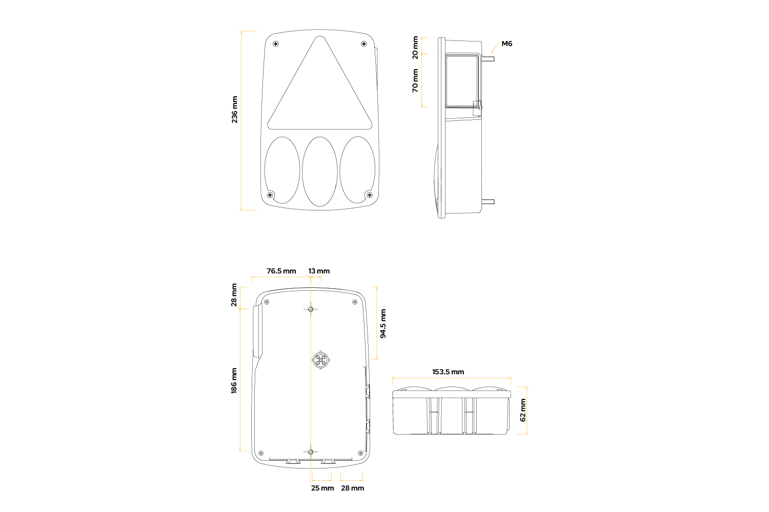 La lampada posteriore Earpoint IV di ASPÖCK è destinata all'installazione sul lato sinistro del veicolo e ha le seguenti dimensioni: larghezza 153,5 mm, altezza 236 mm, profondità 62 mm . Dotato di connettore a baionetta a 5 pin , consente un'installazione facile e veloce in rimorchi, autobus e carri attrezzi .