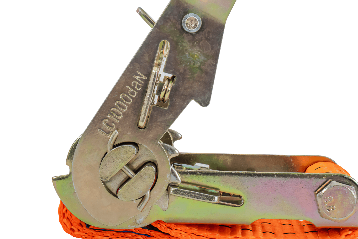 La cinghia a cricchetto arancione UNITRAILER è composta da due parti: una parte più corta con cricchetto e gancio, e una parte più lunga con cinghia e gancio. La lunghezza totale della cinghia, inclusa cinghia e fibbia, è di 4 metri , offrendo una lunghezza sufficiente per una varietà di applicazioni di trasporto. La cinghia larga 35 mm offre una superficie di serraggio ottimale. La cinghia ha una resistenza alla trazione di 2 tonnellate (2000 daN) , consentendo un ancoraggio sicuro e un fissaggio stabile del carico durante il trasporto.