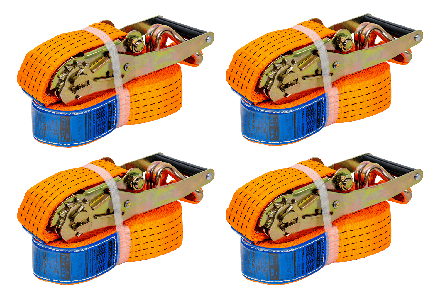 Un set di quattro cinghie a cricchetto UNITRAILER arancioni , ciascuna composta da due parti: una più corta con cricchetto e gancio, e una più lunga con cinghia e gancio. La lunghezza totale di ciascuna cinghia, inclusa cinghia e fibbia, è di 6 metri , sufficiente per fissare carichi più grandi. La cinghia larga 50 mm fornisce un'ampia pressione. Ogni cinghia ha una robusta forza di tensionamento fino a 5 tonnellate (5000 daN) , rendendo il set ideale per fissare carichi più pesanti che richiedono più punti di ancoraggio.
