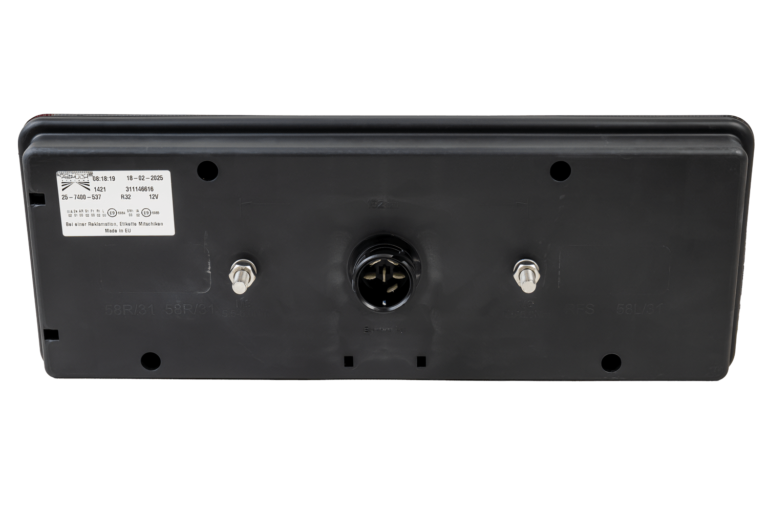 La lampada posteriore Europoint III di ASPÖCK è destinata all'installazione sul lato destro del veicolo e ha le seguenti dimensioni: larghezza 400 mm, altezza 153 mm, profondità 88 mm . Dotato di un connettore ASS2.1 a 7 pin , consente un'installazione facile e veloce in rimorchi, autobus e carri attrezzi .