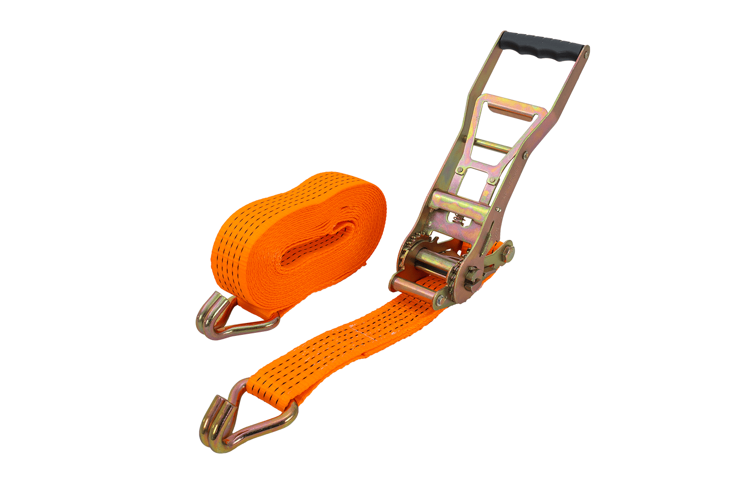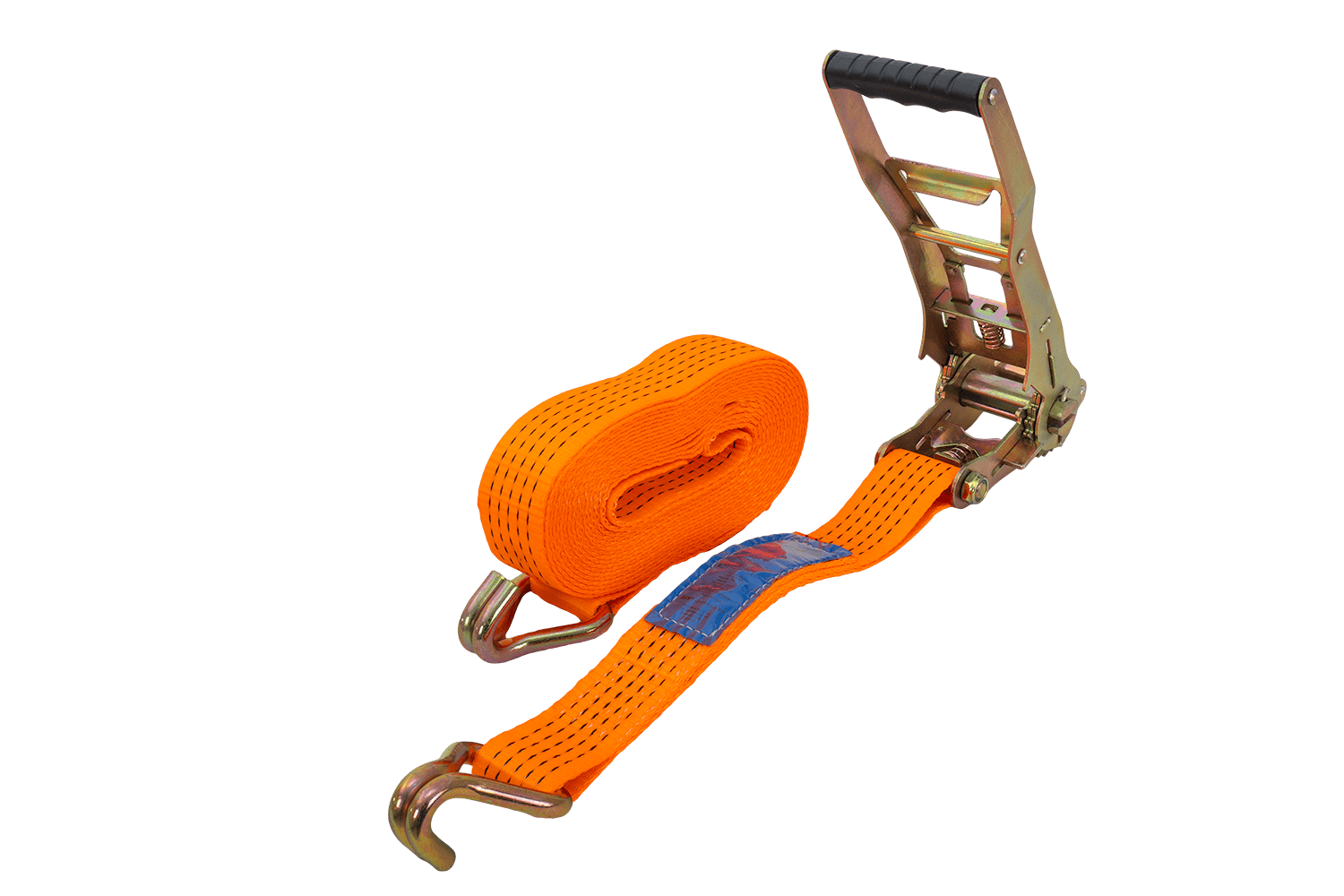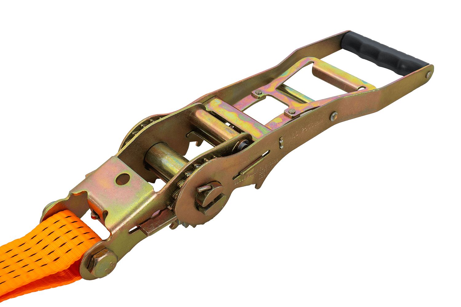La cintura da trasporto arancione con tenditore ERGO è composta da due parti: una più corta con un tenditore avanzato (cioè un sonaglio) e un gancio, ed una più lunga con una cinghia anch'essa terminante con un gancio. È caratterizzato da una maggiore durata e un livello di sicurezza più elevato grazie allo speciale design del tenditore, che fornisce un parametro STF più elevato, consentendo così di premere più saldamente il carico a terra. La lunghezza totale della cintura, comprese fettuccia e fibbia, è di 8 metri, fornendo una lunghezza sufficiente per fissare carichi più grandi. La larghezza del nastro di 50 mm fornisce una superficie di pressatura adeguata. La cinghia ha una solida resistenza - fino a 5 tonnellate (5000 daN) e la struttura rinforzata dell'intero meccanismo di tensionamento garantisce affidabilità durante il fissaggio di carichi più pesanti, facilitando notevolmente il funzionamento.