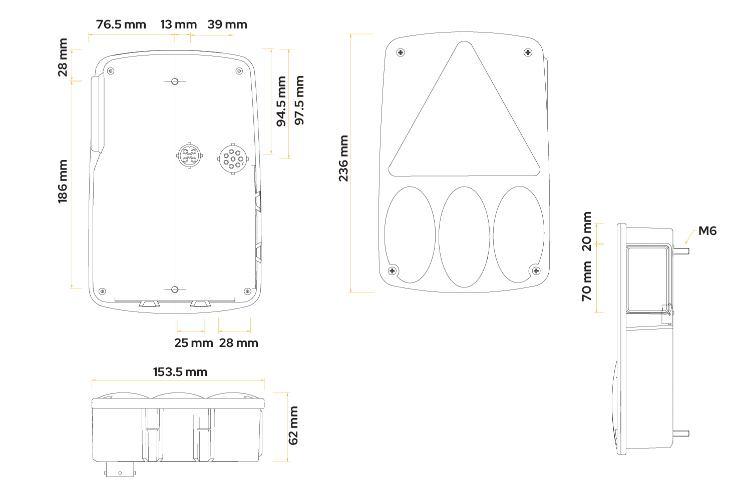 La lampada posteriore Earpoint IV di ASPÖCK è destinata all'installazione sul lato destro del veicolo e ha le seguenti dimensioni: larghezza 153,5 mm, altezza 236 mm, profondità 62 mm . Dotato di connettori a baionetta a 5 e 8 pin , consente un'installazione facile e veloce in rimorchi, autobus e carri attrezzi .