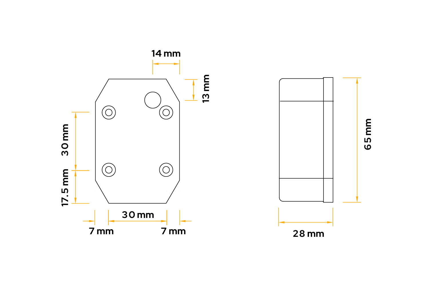 La luce di posizione FLEXIPOINT I di ASPÖCK, progettata per il montaggio sia sul lato sinistro che destro del veicolo , è caratterizzata dalle seguenti dimensioni: larghezza 44 mm, altezza 65 mm, profondità 28 mm . Dotato di un cavo piatto da 0,5 m , consente un'installazione facile e veloce e può essere utilizzato su veicoli per le consegne, rimorchi, semirimorchi e camper .