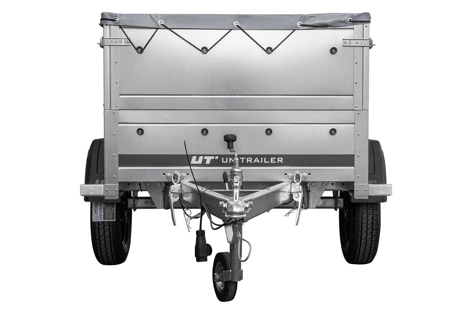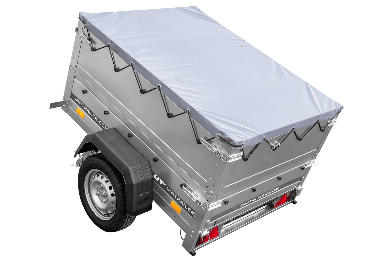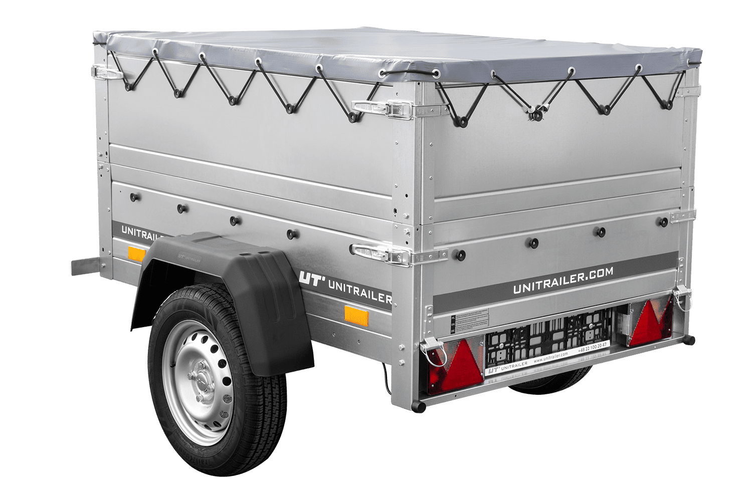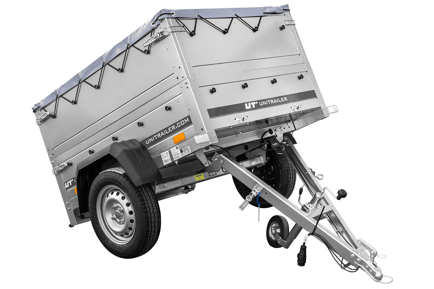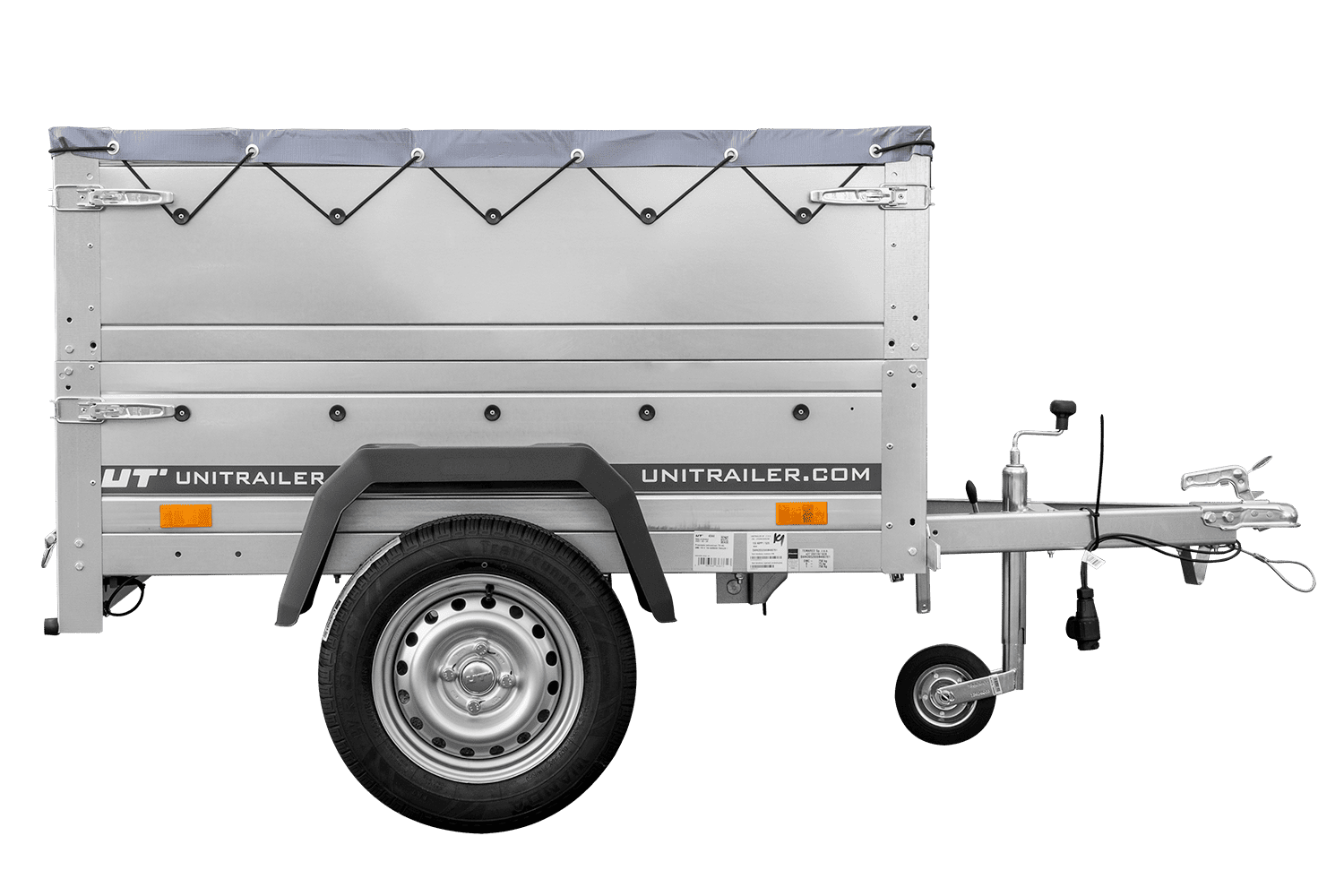 - Il rimorchio trasporto cose per auto GARDEN TRAILER 150 KIPP di UNITRAILER con timone inclinato, in un set con sovrasponde, un ruotino d'appoggio e un telo piatto grigio. Dimensioni: 1475 x 1063 mm, PTT 750 kg.