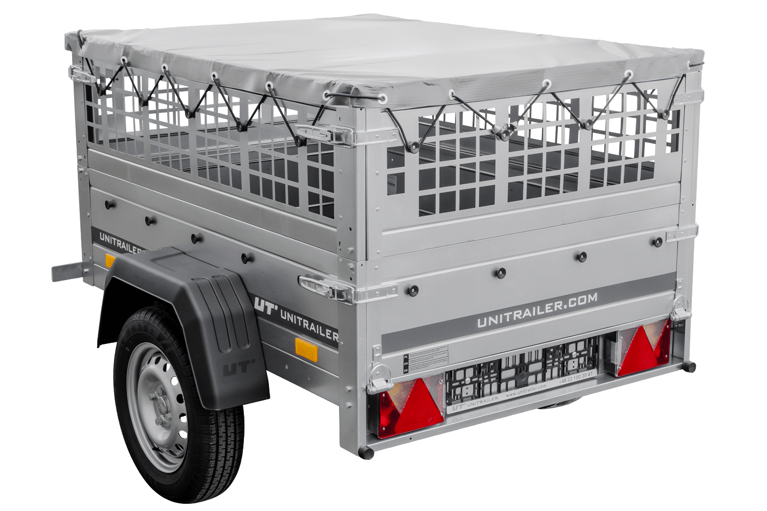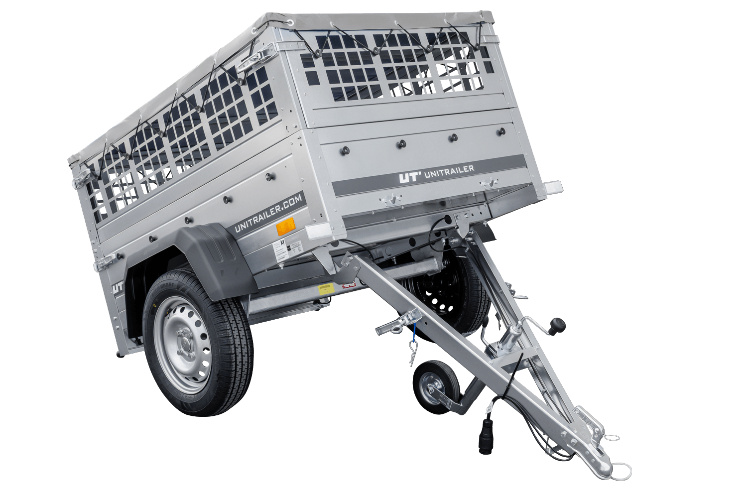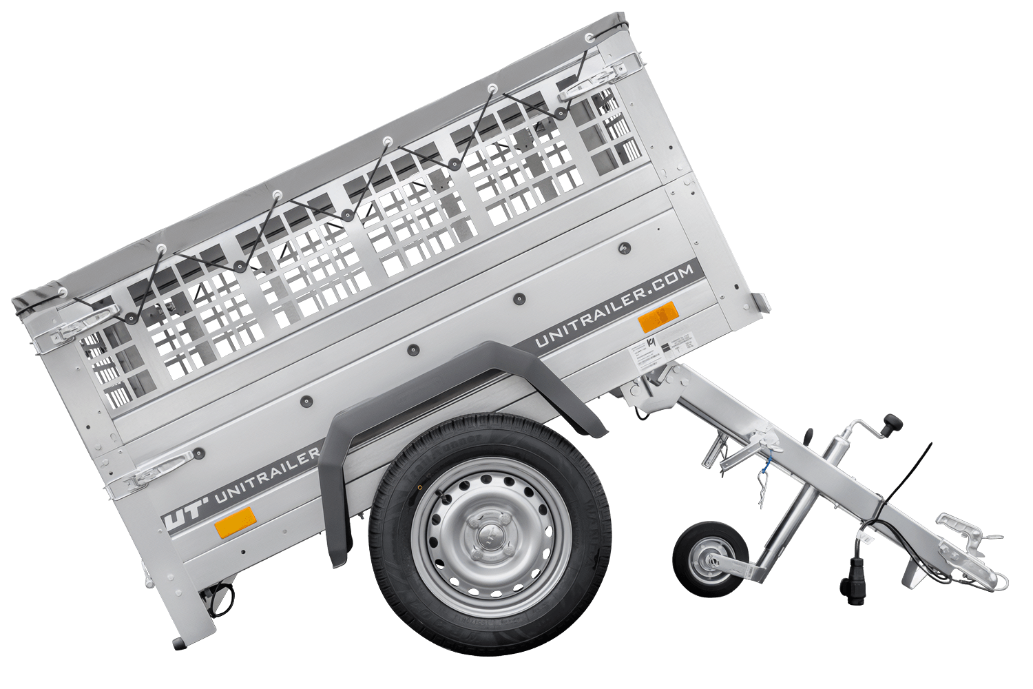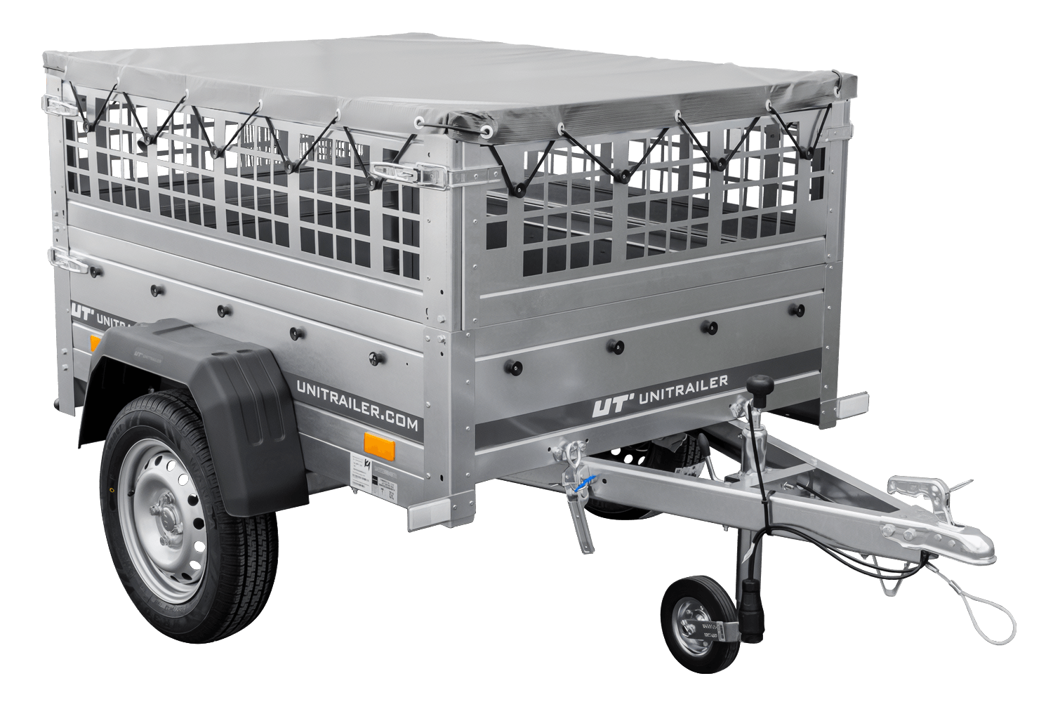 rimorchio leggero senza freni 750 kg Unitrailer Garden Trailer 150 kipp (new) con ruotino sovrasponde a rete e telo grigio