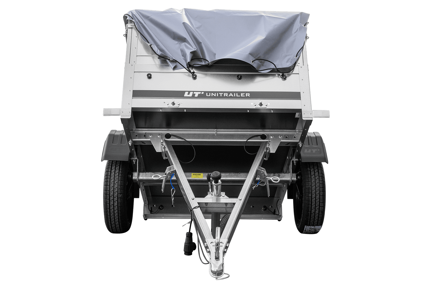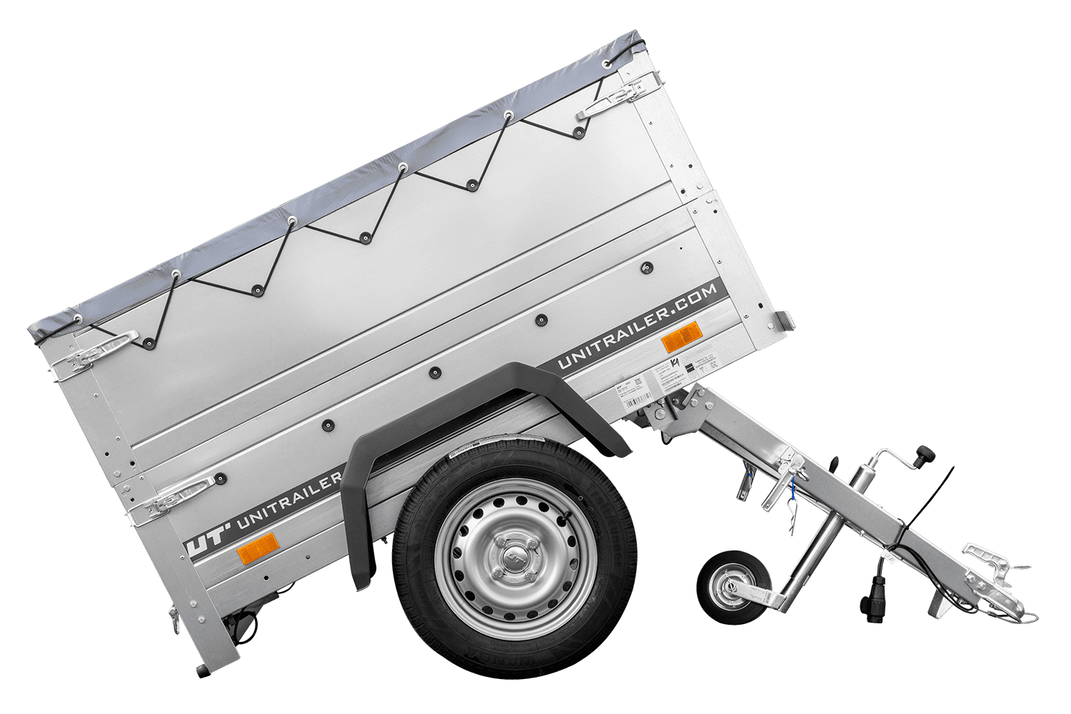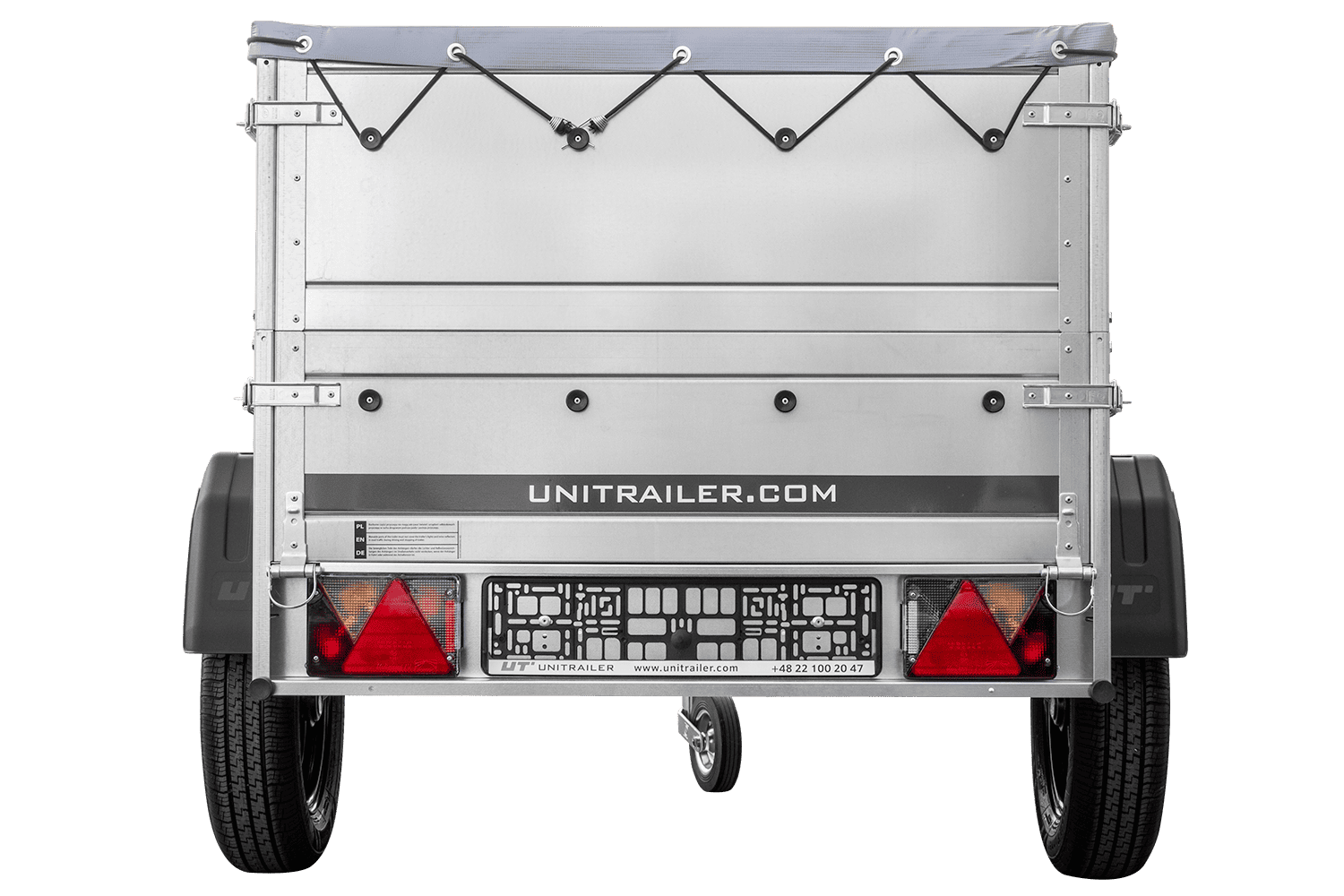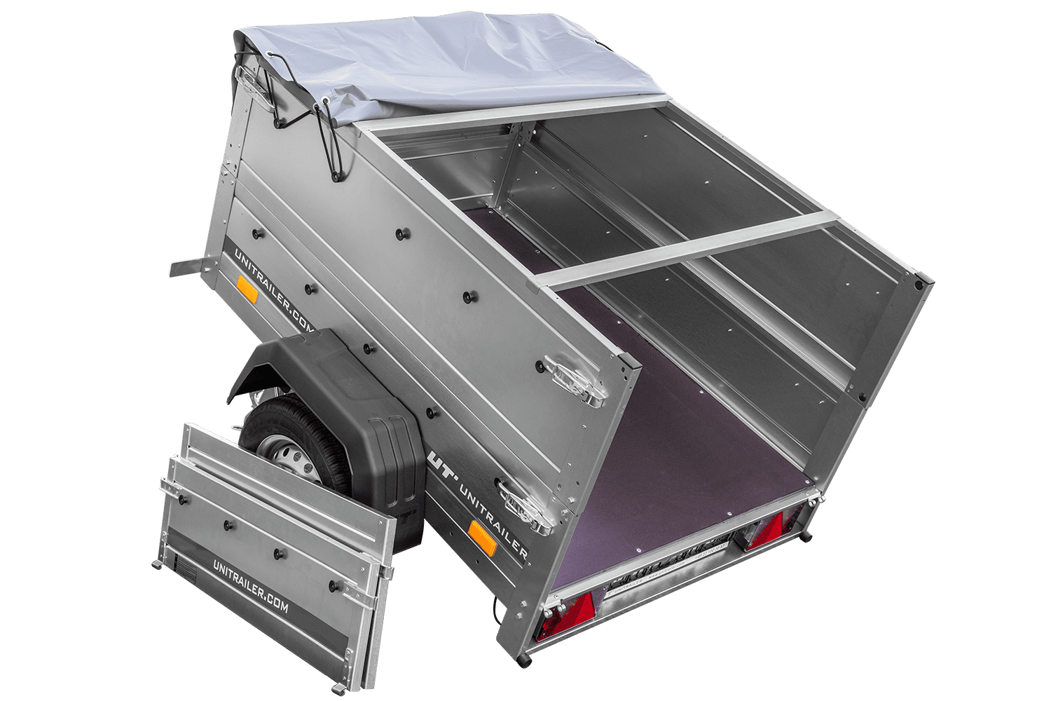 Rimorchio monoasse UNITRAILER Garden Trailer 150 KIPP con ruota d'appoggio, bis sponde e copertura piatta grigia su telaio H0, disponibile con spedizione ovunque in Polonia o Europa, destinato a chi cerca un rimorchio piccolo e ben guidabile. Grazie al PTT da 300 a 750 kg, può essere trainato da una normale automobile con patente di categoria B. Ulteriori travi del telaio H0 irrigidiscono la struttura e impediscono il cedimento della copertura sulla superficie di trasporto, ad esempio in caso di forte pioggia .