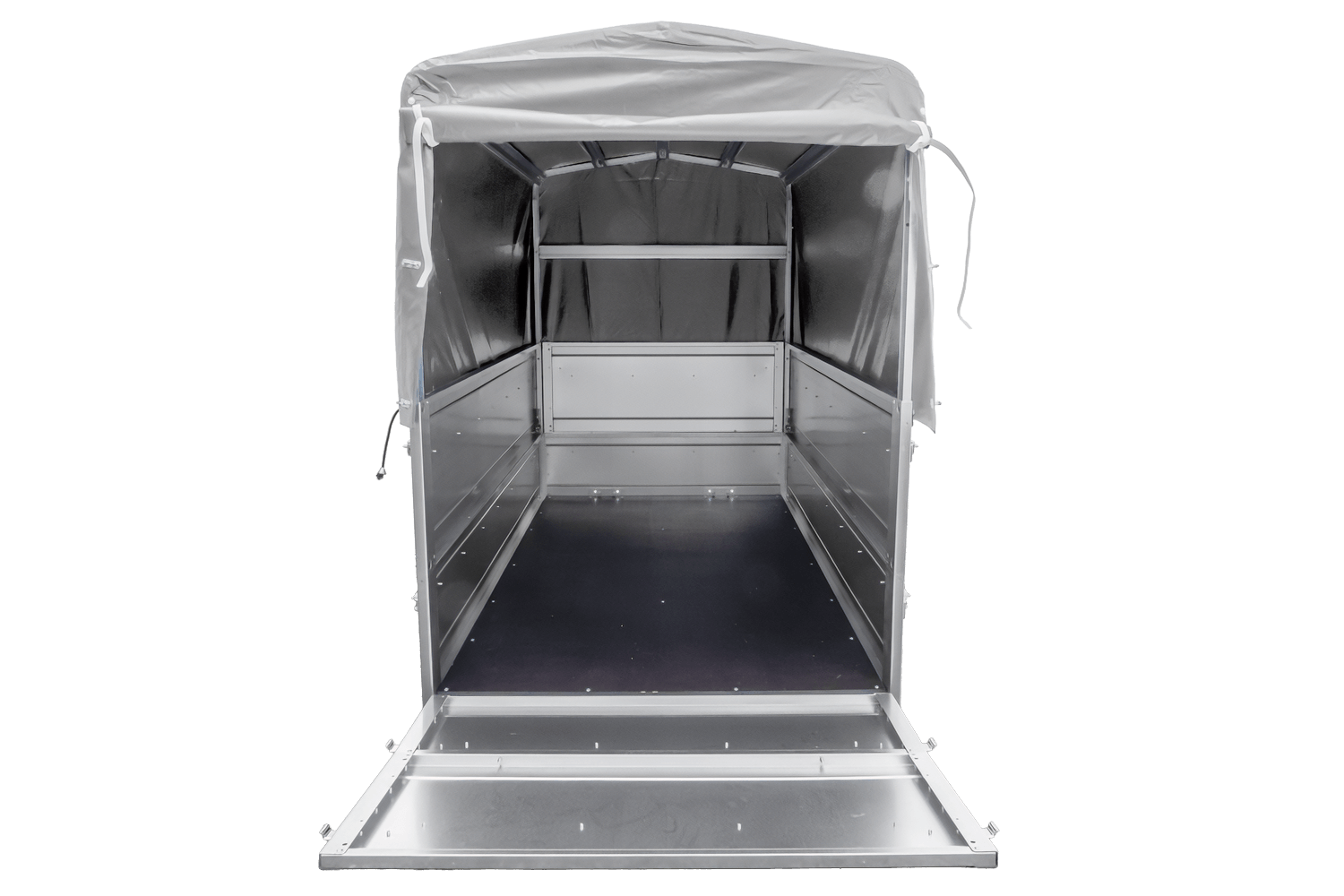La vendità in questione riguarda il rimorchio leggero Garden Trailer 200 KIPP con sovrasponde, centina con telo grigio e ruotino d'appoggio di serie.
