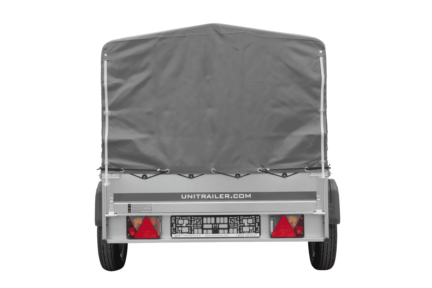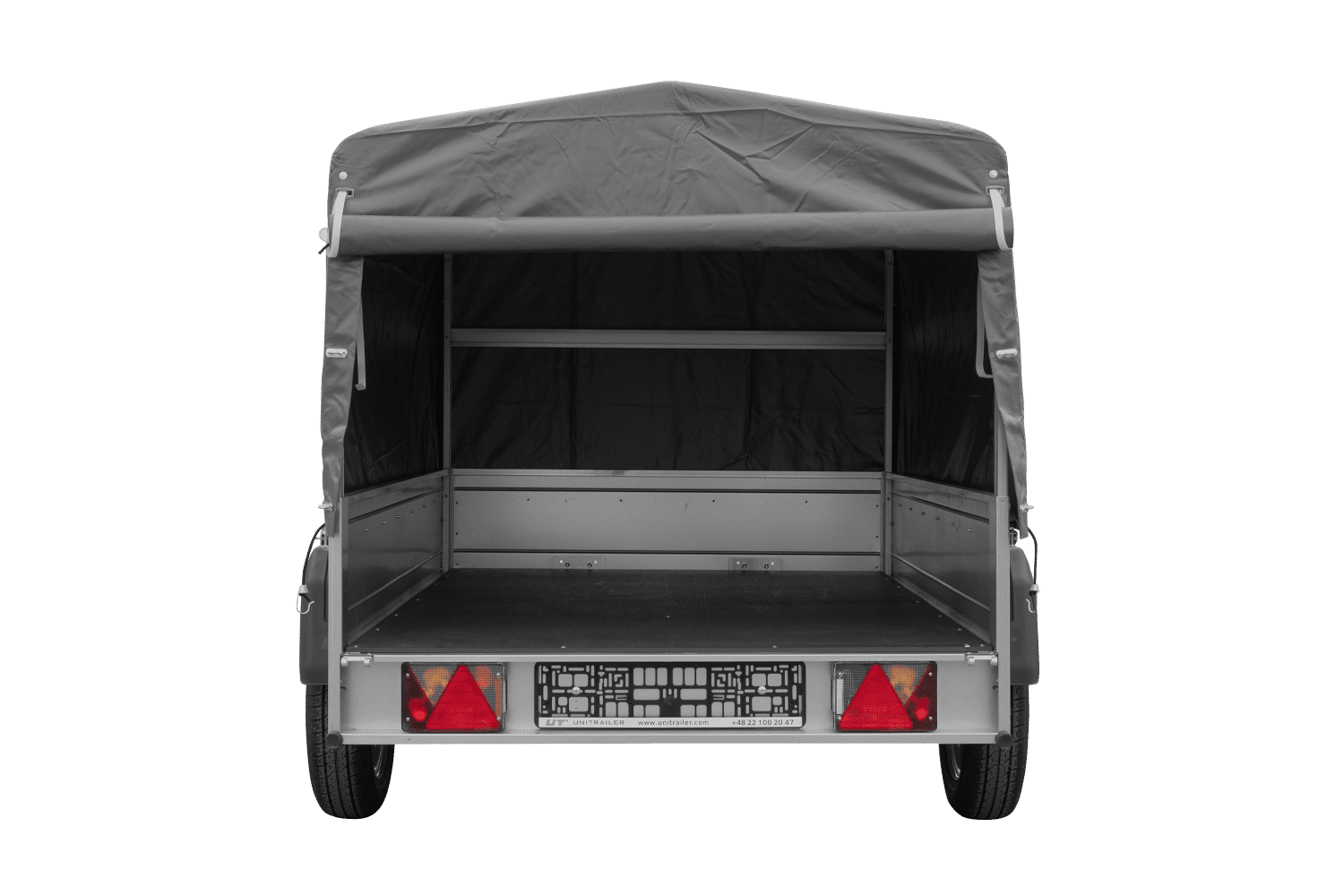 - TELAIO – un rinomato assale a torsione di nuova generazione con sospensioni a barre di torsione, che garantisce eccellenti condizioni di guida. Il timone a V girevole termina con un gancio a sfera con indicatore di aggancio. Le ruote per tutte le stagioni 155/70 R13 assorbono efficacemente le asperità del manto stradale e consentono una guida confortevole con il rimorchio. Il telaio di supporto è realizzato con profilati in lamiera d'acciaio zincata a caldo, piegati e imbullonati tra loro.