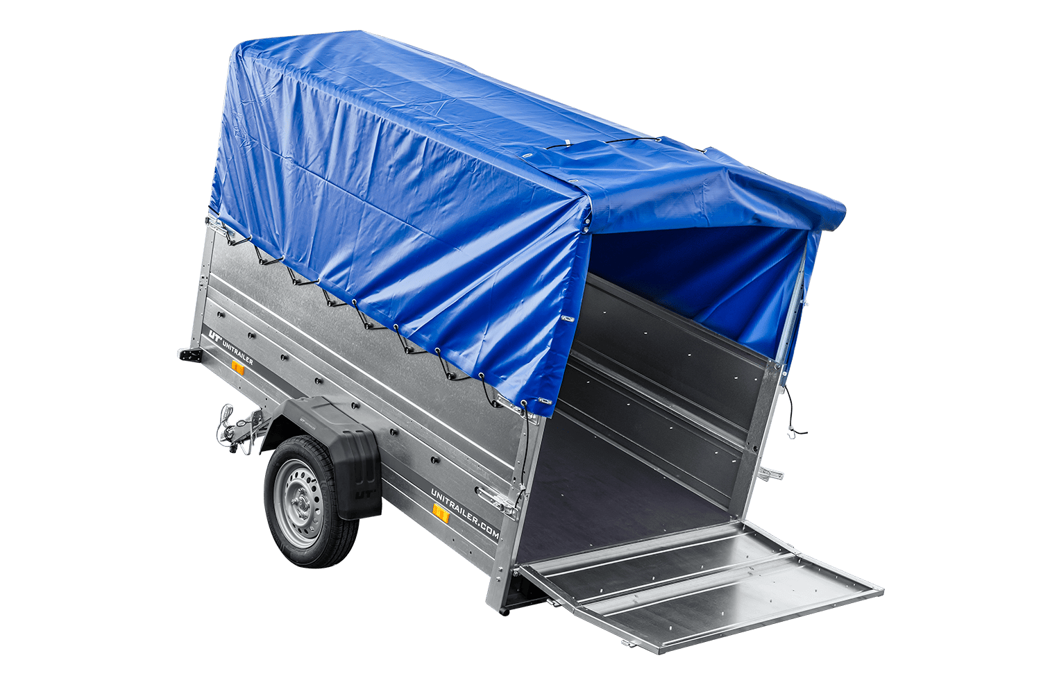 Rimorchio Garden Trailer 230 KIPP con ruotino di appoggio, sovrasponde e centina H-800 con telo blu