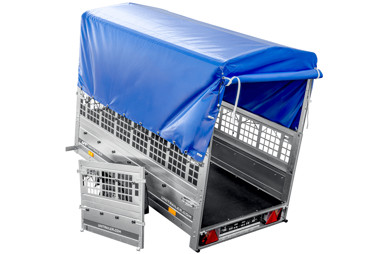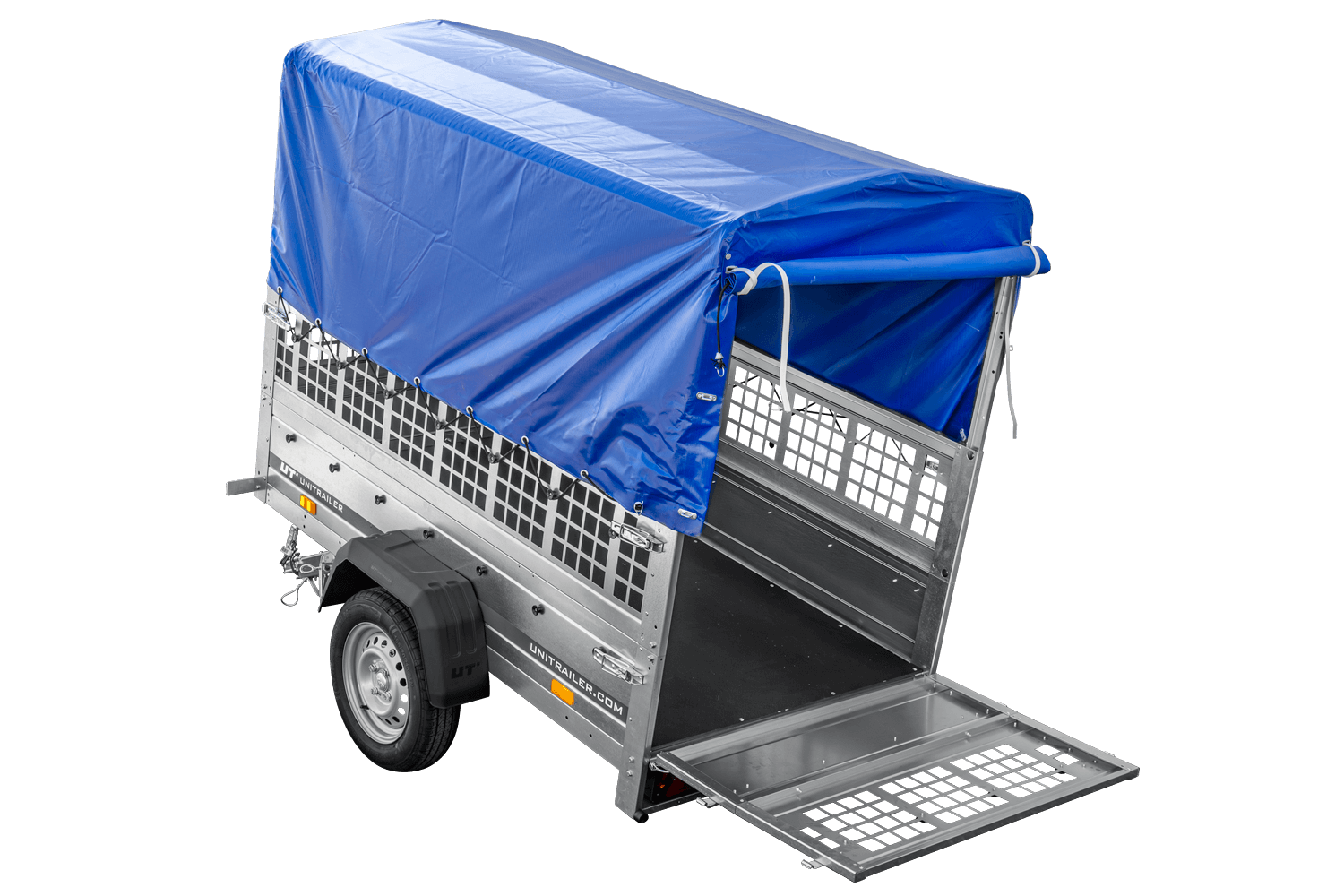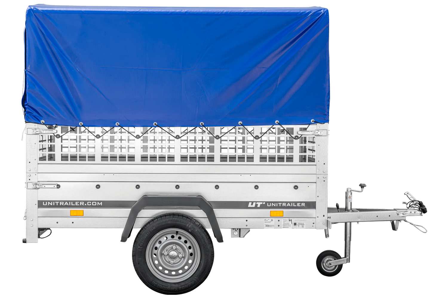RIMORCHIO CARELLO TRASPORTO COSE RIMORCHIO LEGGERO 750 KG UNITRAILER GARDEN TRAILER 200 KIPP CON SOVRASPONDE A RETE RUOTINO CENTINA E TELO BLU