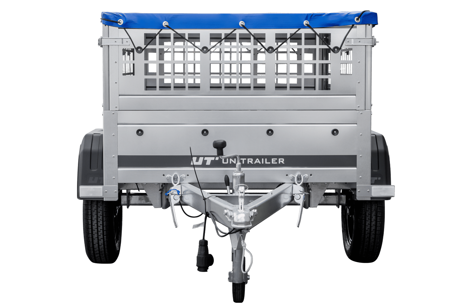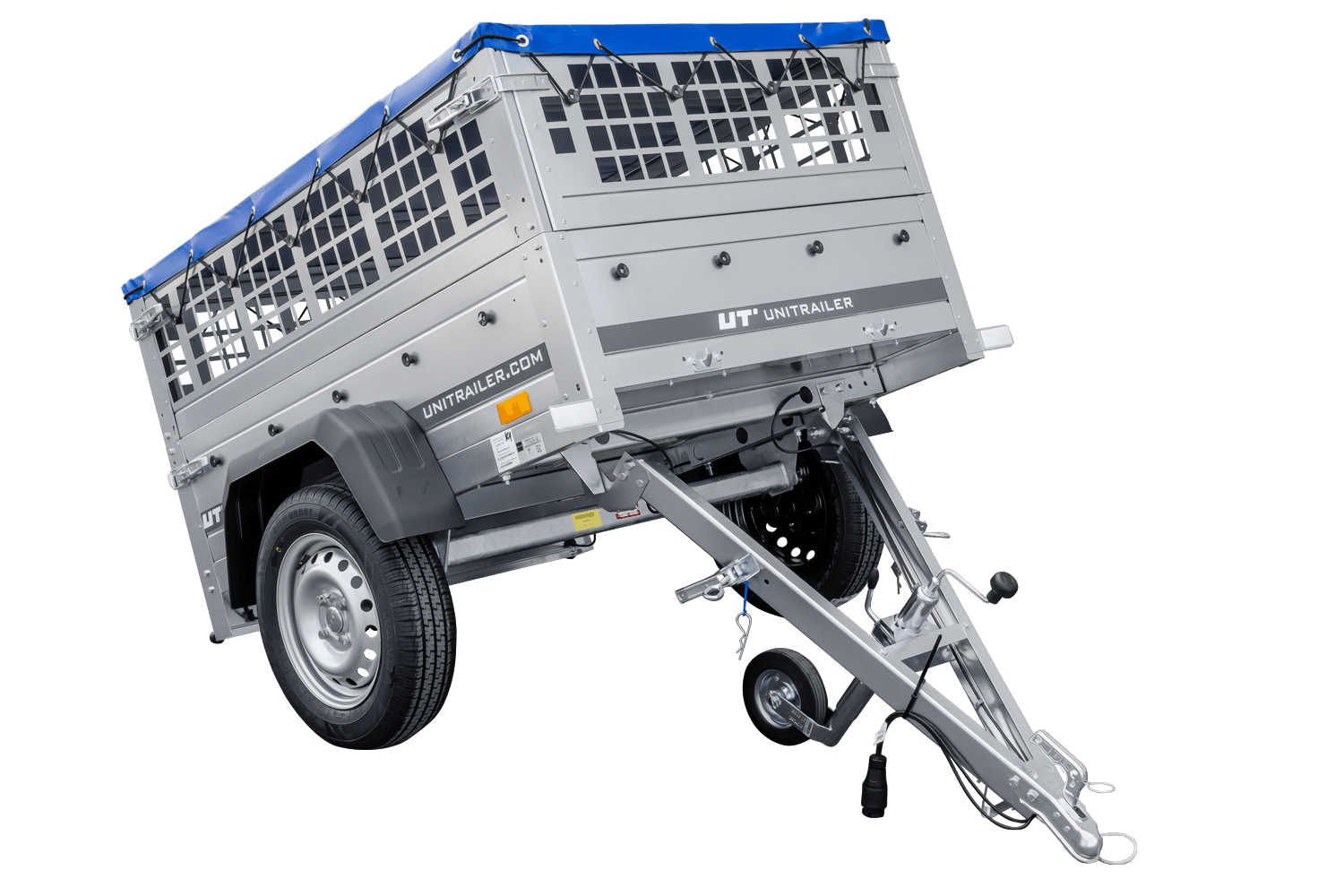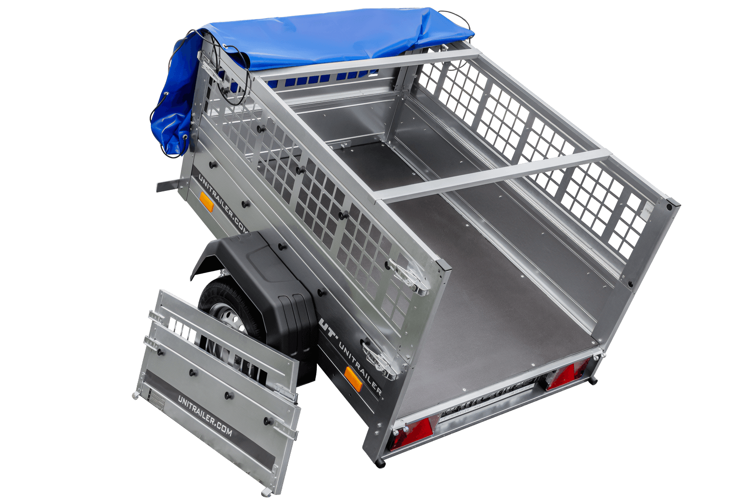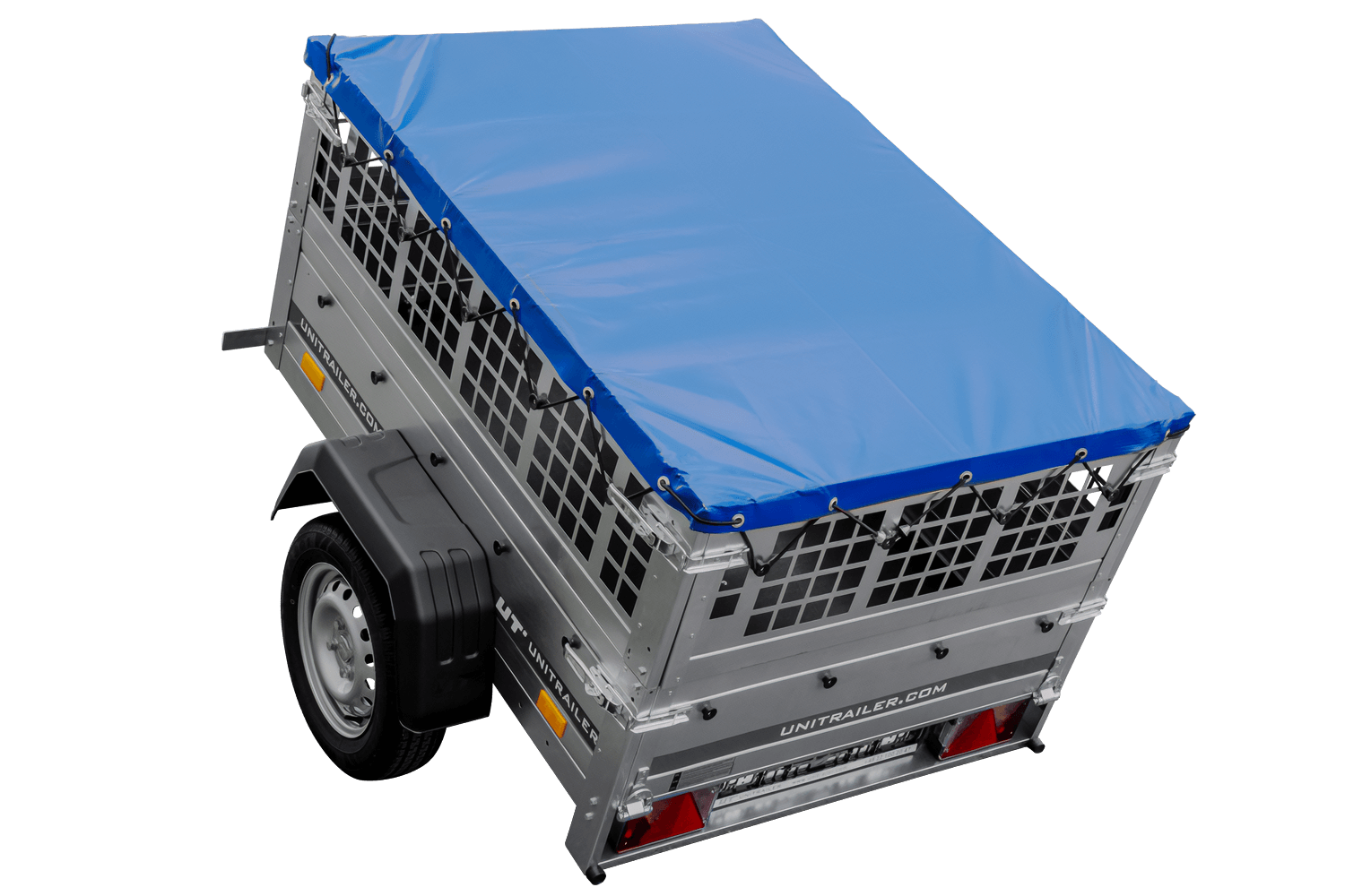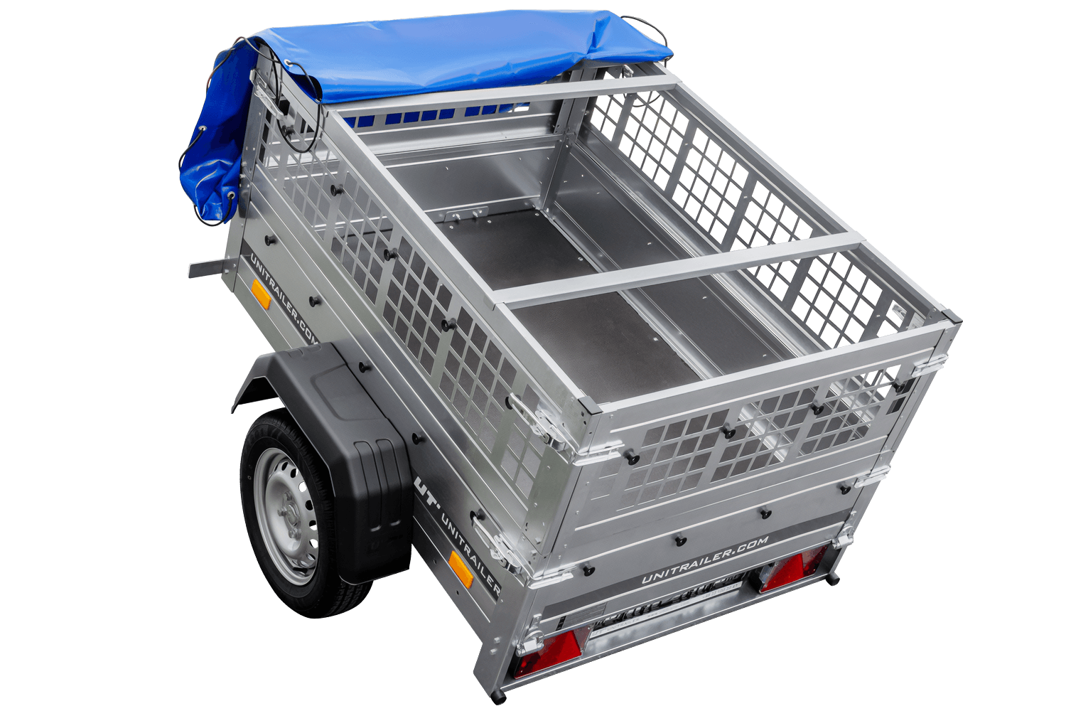 - Rimorchio Rimorchio Giardino 150 KIPP con dimensioni 150x106 con sponde in rete, copertura piana blu e ruota di appoggio. PTT fino a 750 kg. Perfetto per i lavori in giardino!
