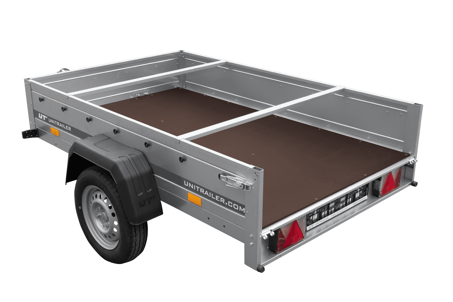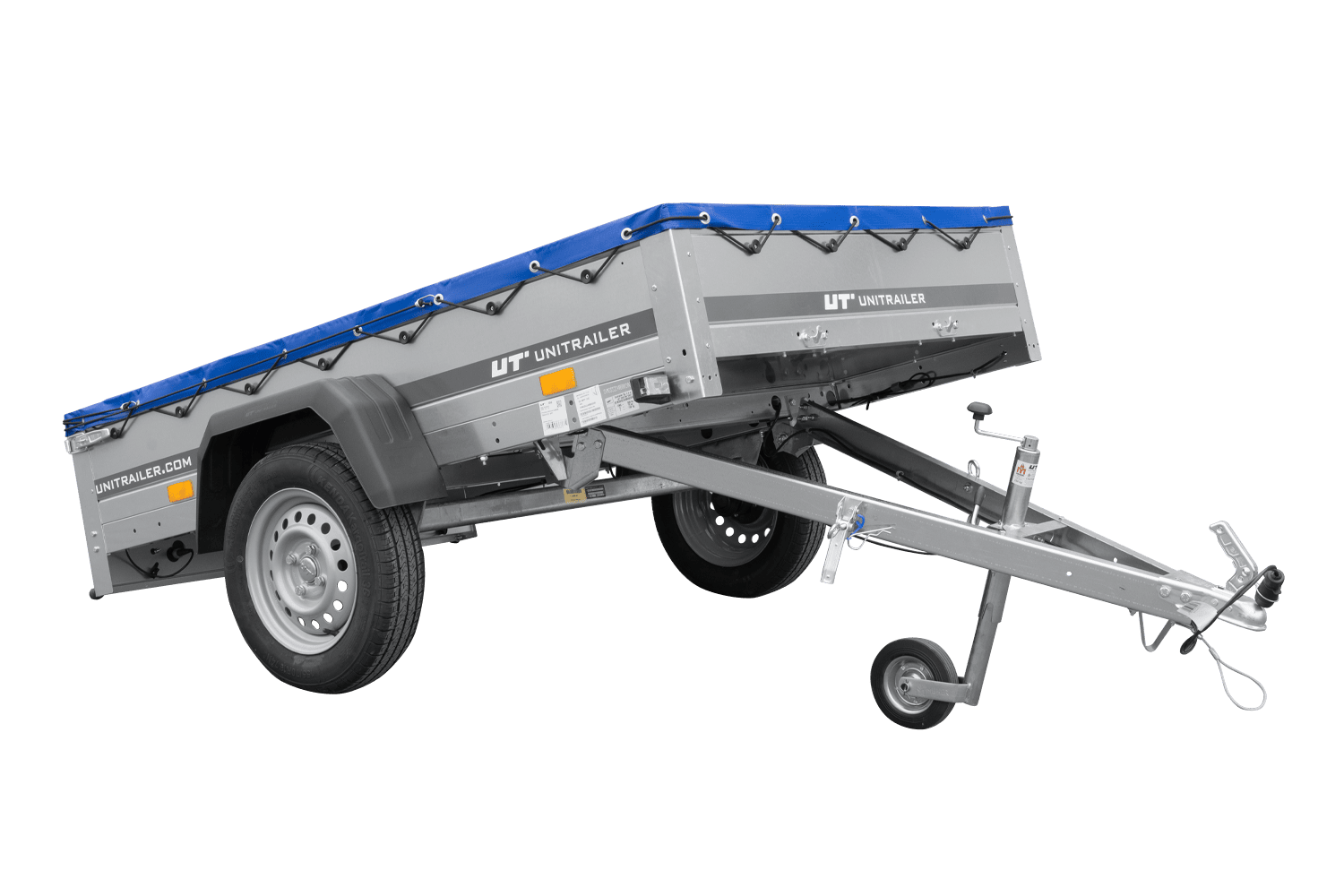 - TELAIO - assale sterzante Knott o ALKO - realizzato su misura per Unitrailer. Dimensioni ruote: 155/70 R13. Timone girevole a V ripiegabile sotto il pianale del rimorchio in qualsiasi momento.
