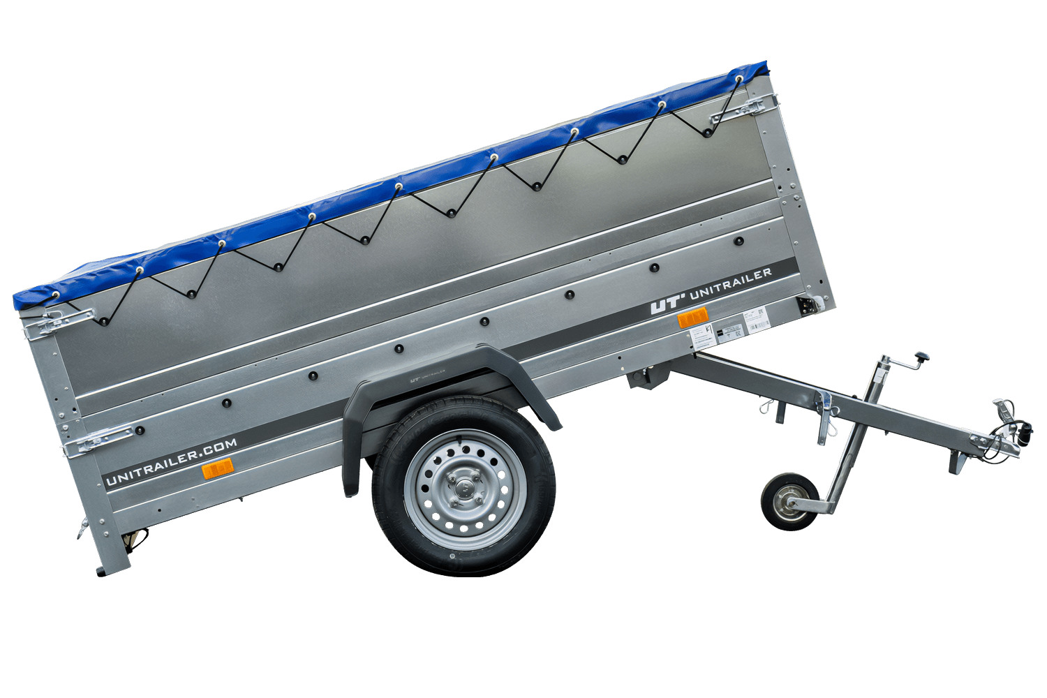 Un rimorchio con una ruota di supporto, due lati e un telone piatto Garden Trailer 230 KIPP
