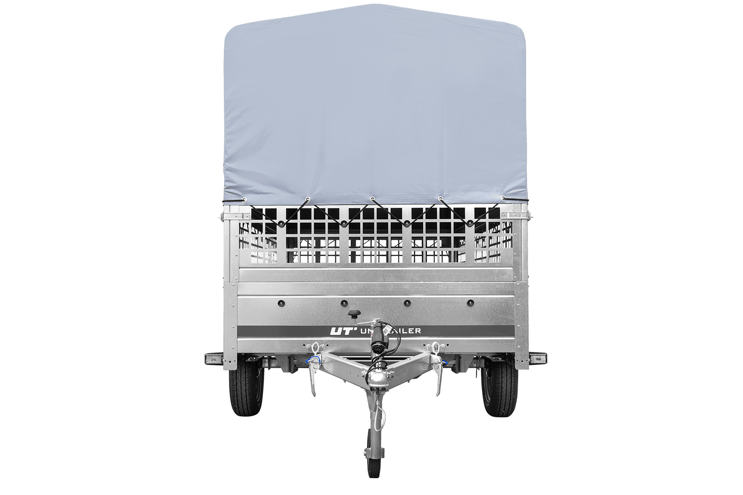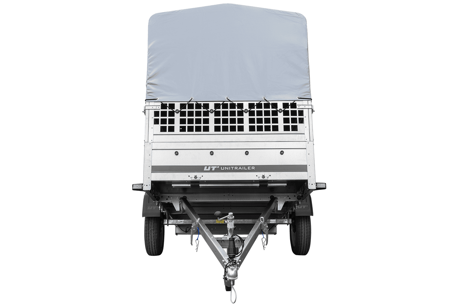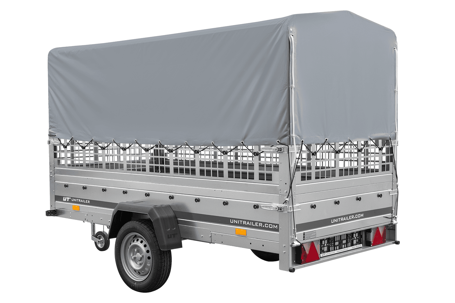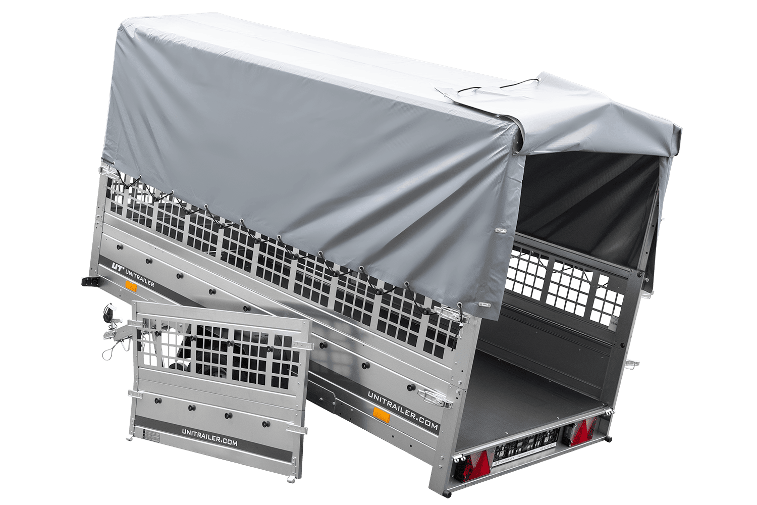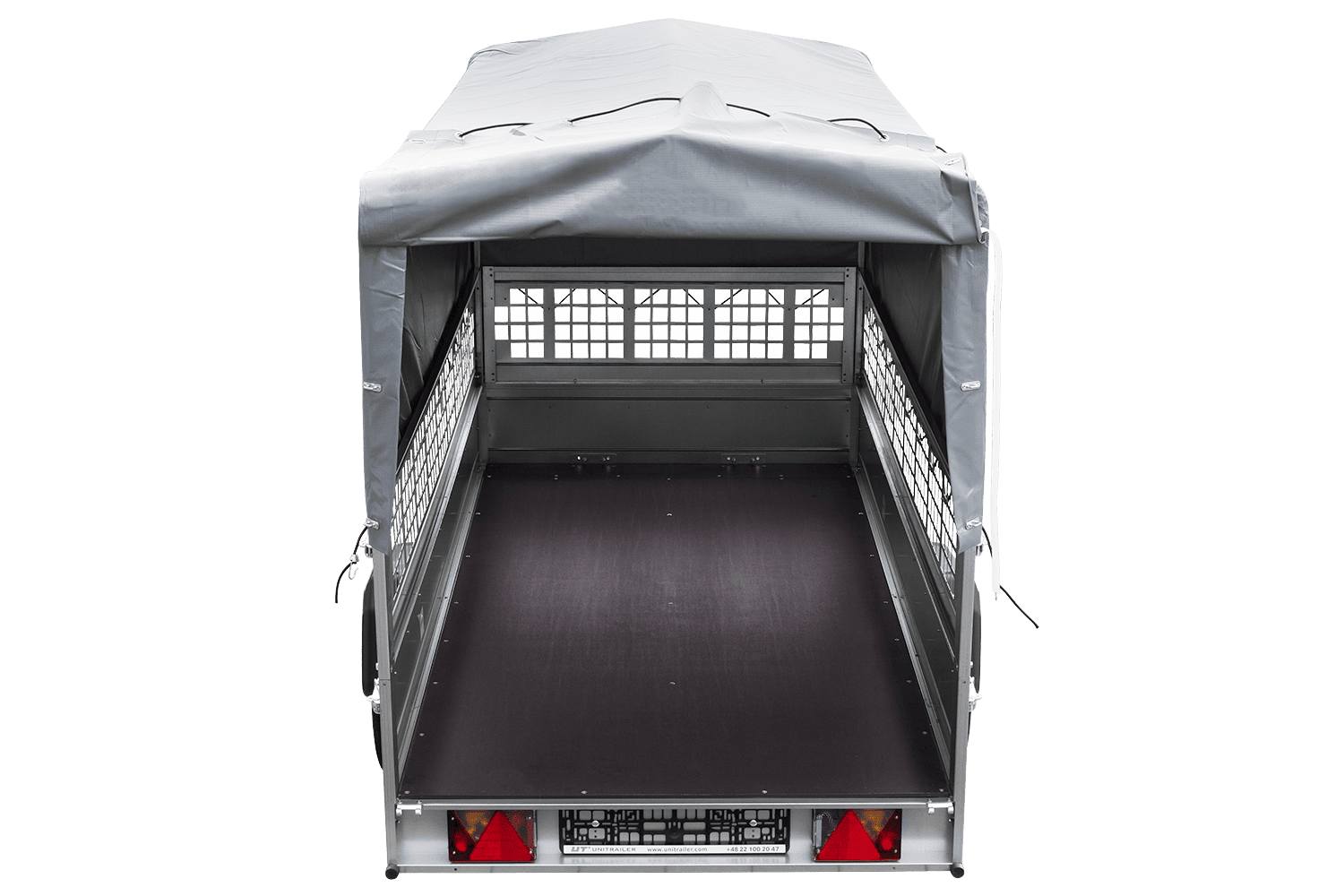 RIMORCHIO TRASPORTO COSE RIMORCHIO LEGGERO 750 KG UNITRAILER GARDEN TRAILER 264 KIPP CON SOVRASPONDE A RETE RUOTINO CENTINA E TELO GRIGIO