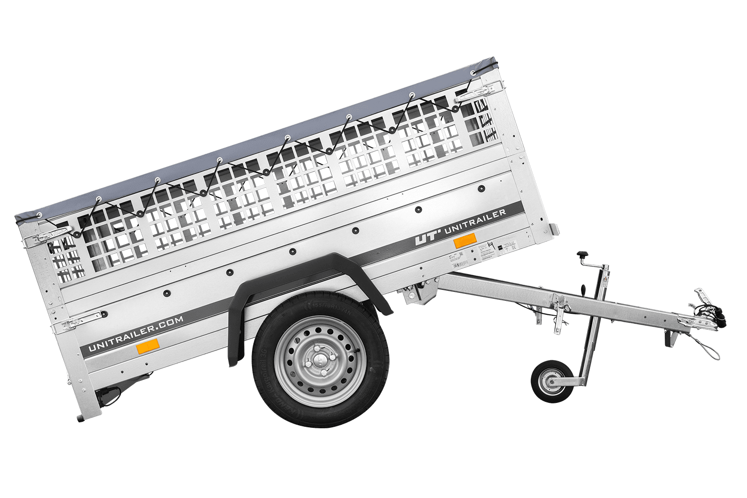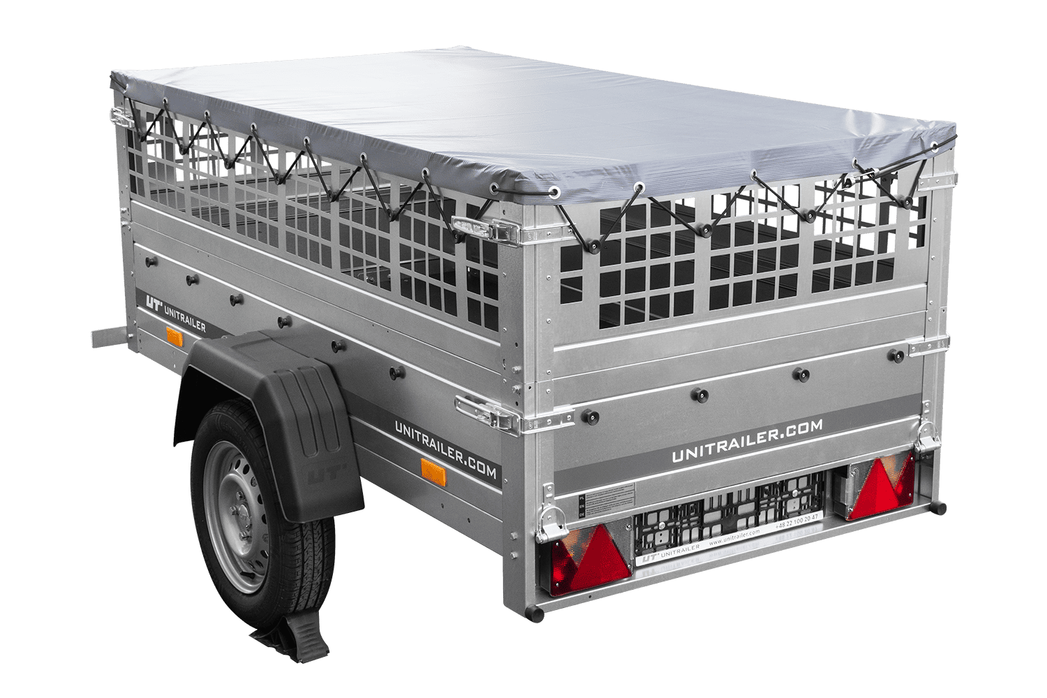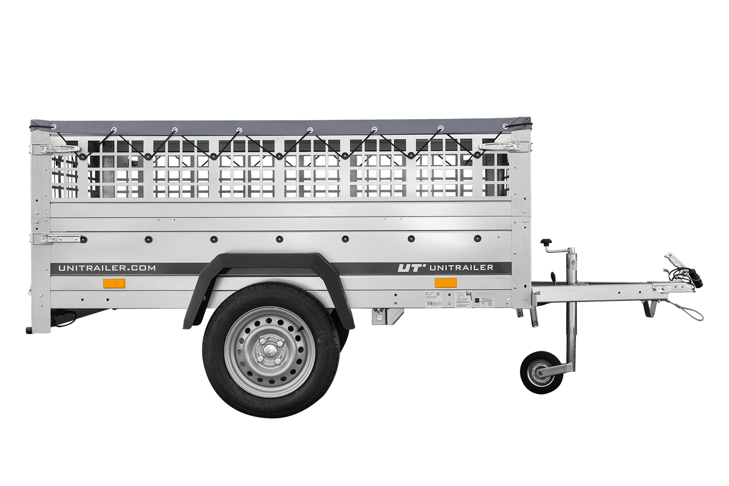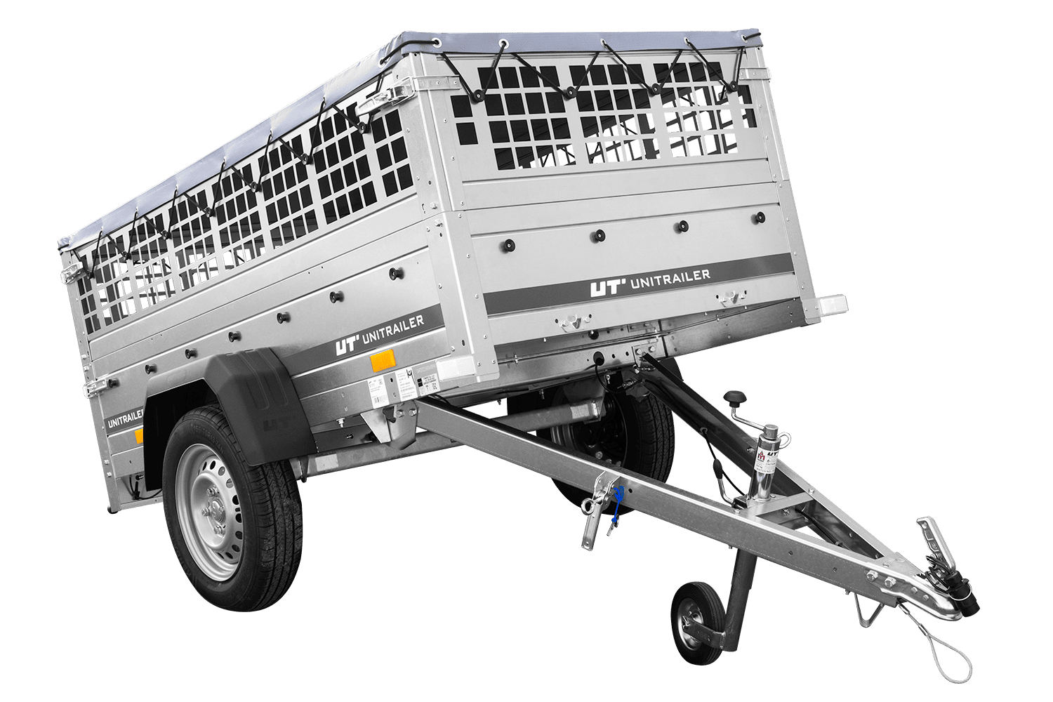 Rimorchio a un asse Unitrailer GARDEN TRAILER 200 KIPP in un set con ruota di supporto, sponde in rete, telaio piatto H-0 e copertura grigia
