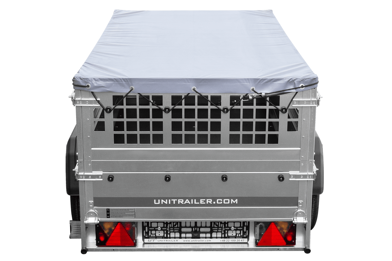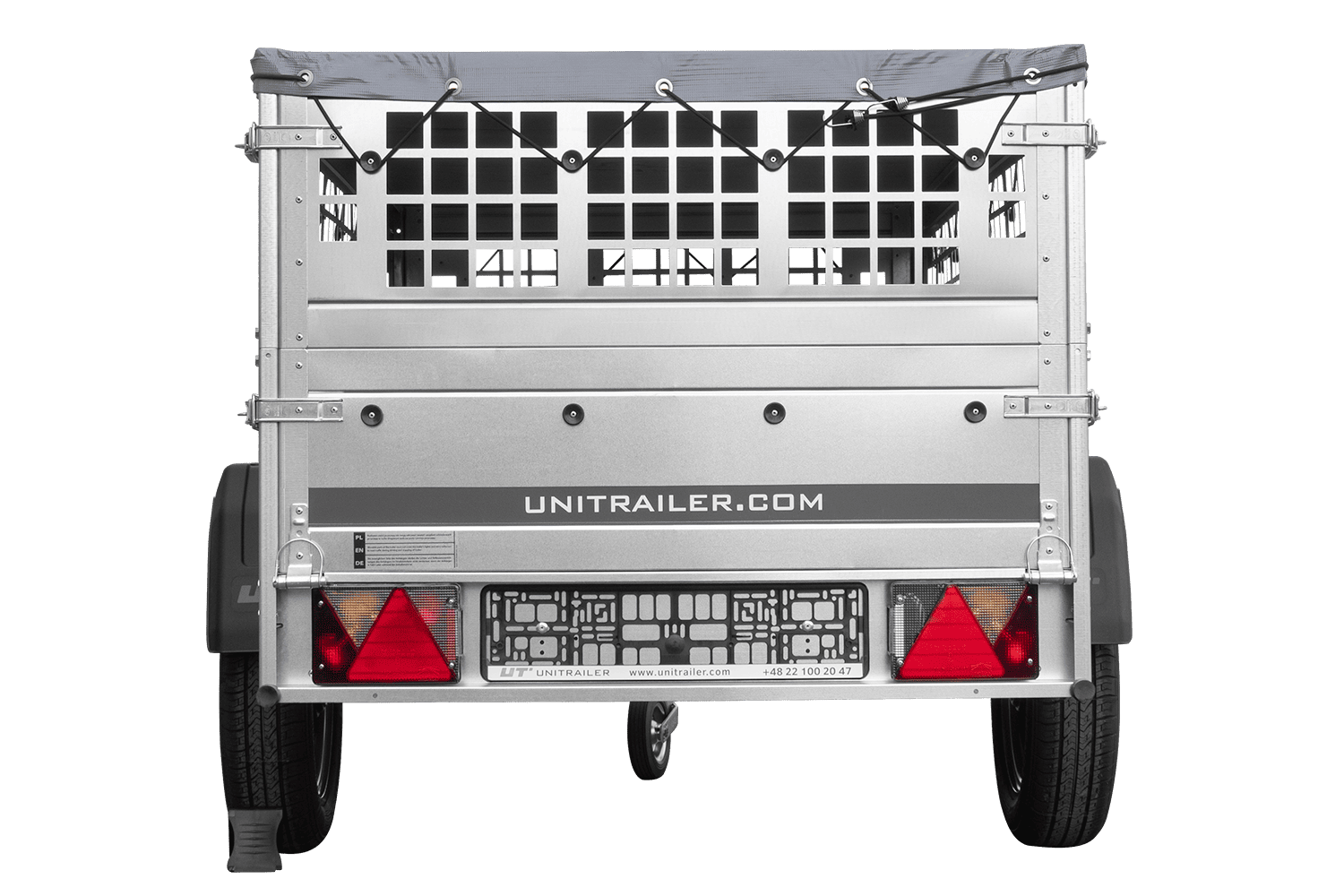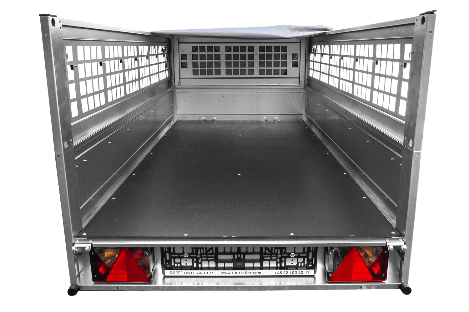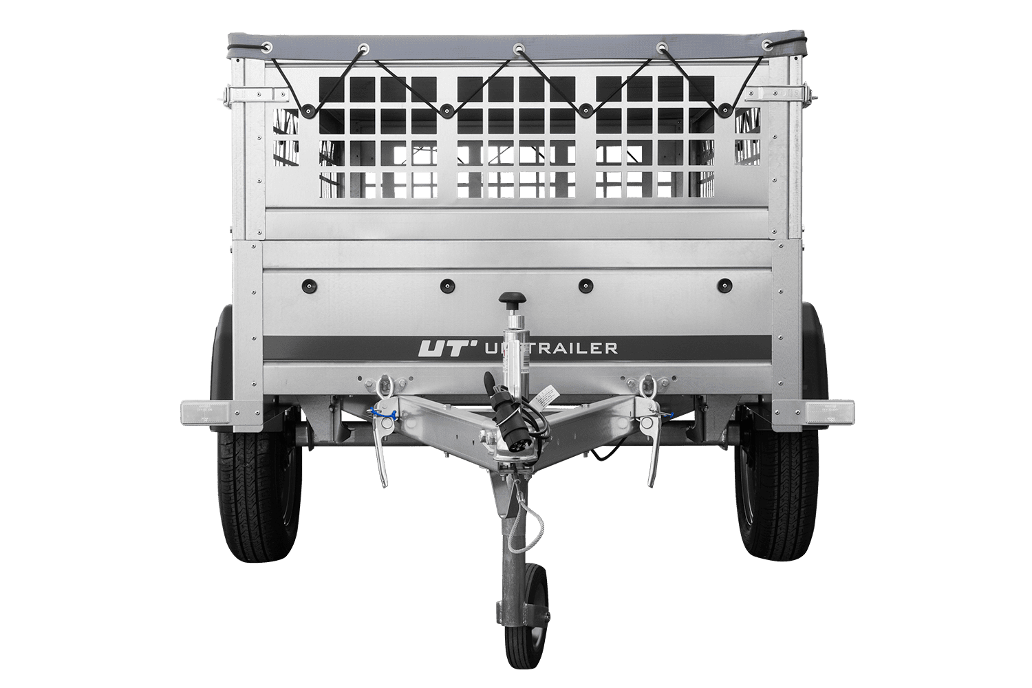 Rimorchio a un asse Unitrailer GARDEN TRAILER 200 KIPP in un set con ruota di supporto, sponde in rete, telaio piatto H-0 e copertura grigia