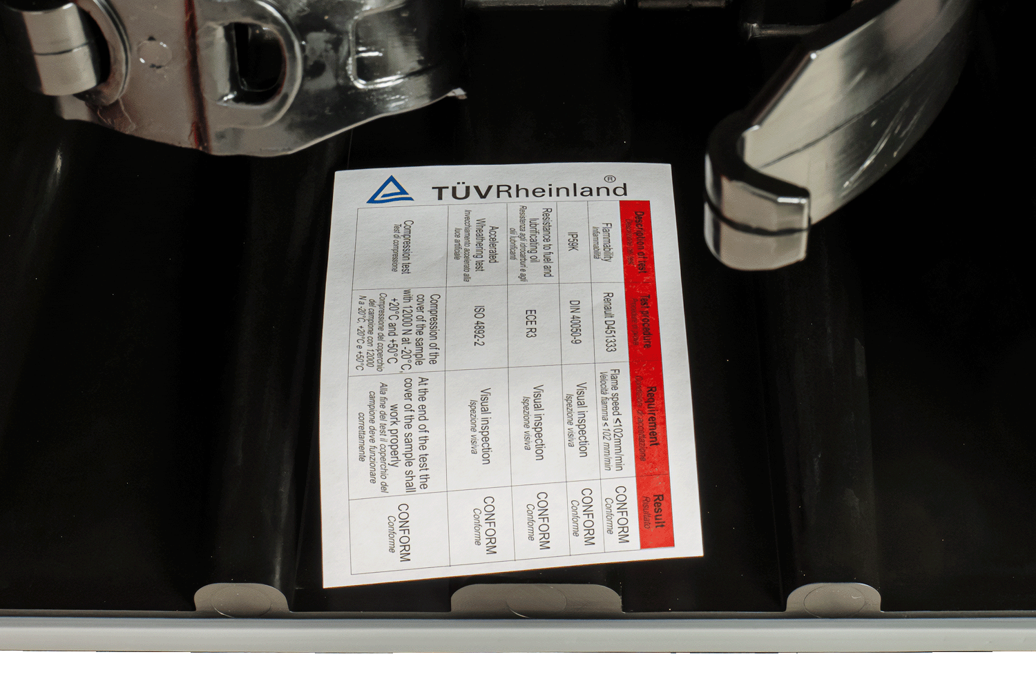 La scatola dell'estintore è approvata VCA come sistema di protezione laterale , E11 73 R - 011168 certificato e prove di laboratorio L'omologazione TÜV Rheinland . VCA conferma che il prodotto può essere utilizzato come elemento protettivo per la zona laterale del veicolo, soddisfacendo i rigorosi requisiti di sicurezza in materia di protezione degli altri utenti della strada. Queste certificazioni attestano l'elevata qualità del prodotto e la sua conformità agli standard internazionali di sicurezza nel trasporto su strada .