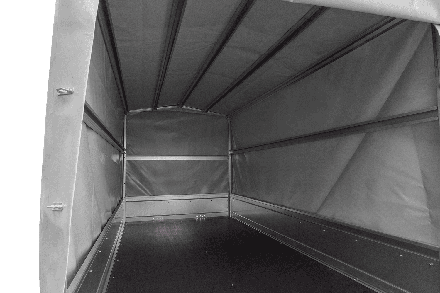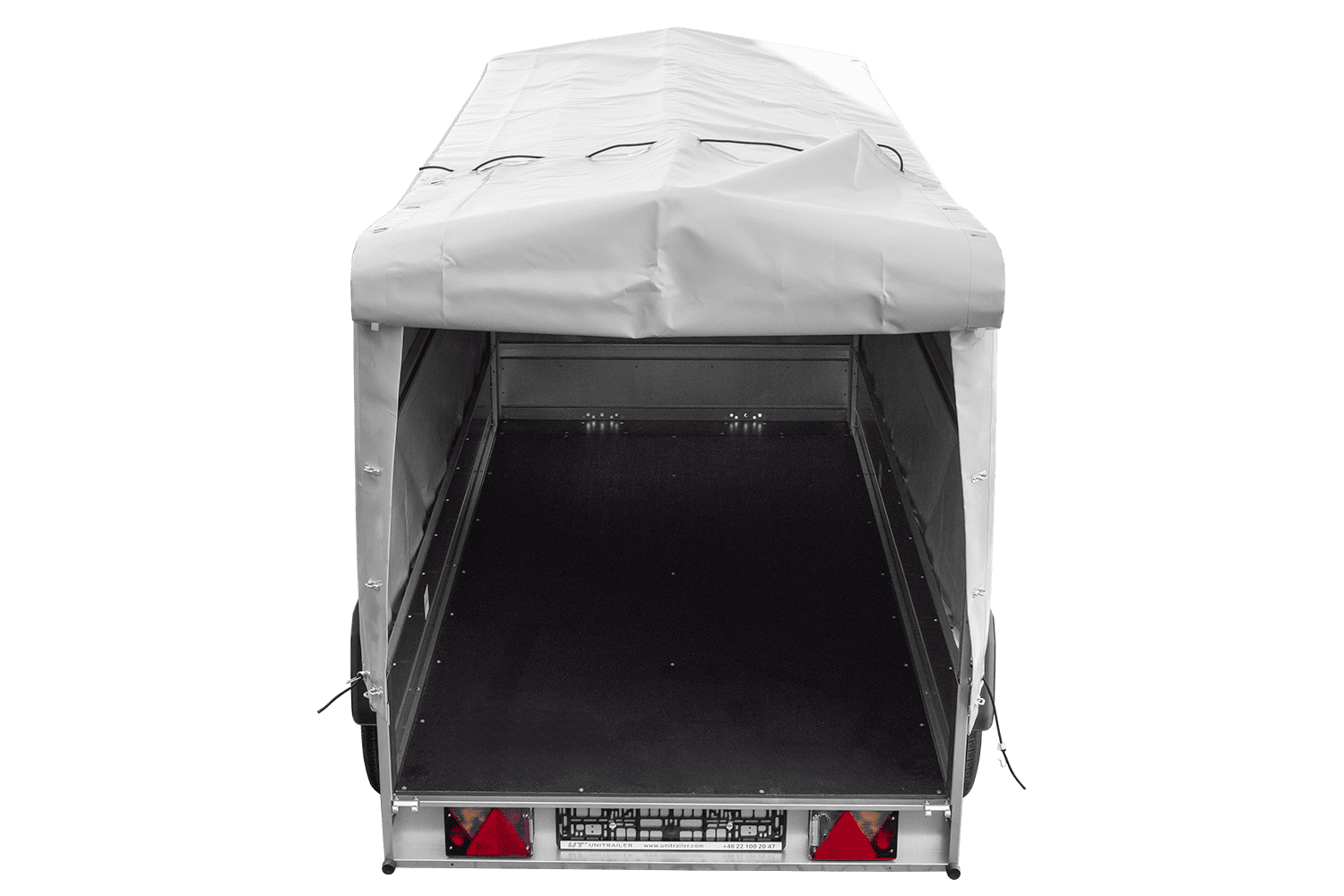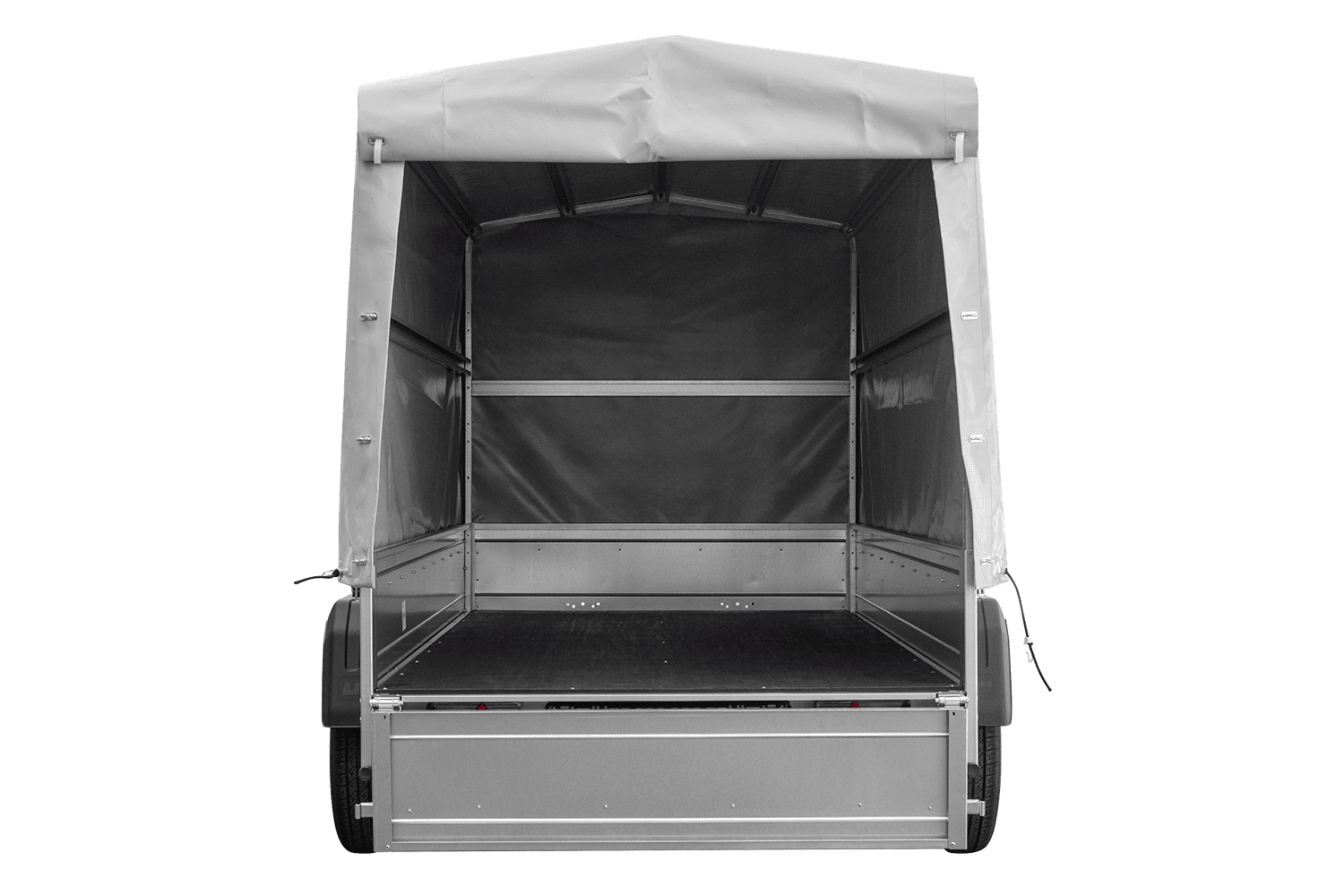 - Il rimorchio Garden Trailer 264/2 KIPP con ruota di supporto, telaio H-1100 e copertura grigia è un rimorchio a due assi con un PTT massimo di 750 kg. Per facilitare il carico e lo scarico, il rimorchio può essere aperto o rimosso.