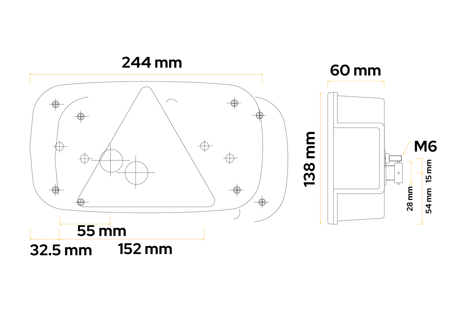 La lampada posteriore Multipoint III di ASPÖCK è destinata all'installazione sul lato sinistro del veicolo e ha le seguenti dimensioni: larghezza 244 mm, altezza 138 mm, profondità 60 mm . Dotato di connettore a baionetta a 8 pin , consente un'installazione facile e veloce in rimorchi, autobus e carri attrezzi .
