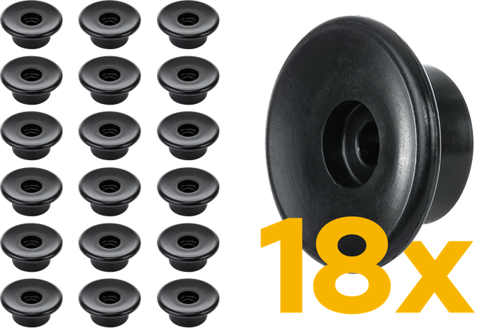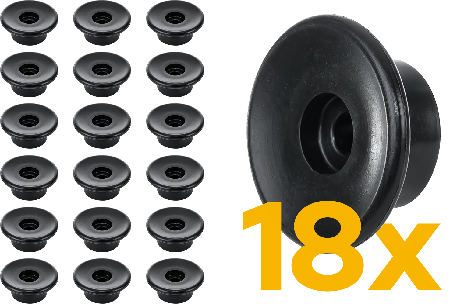 - Set di 18 rulli laterali da 30 mm di diametro per rimorchi per auto e furgoni per le consegne. Progettati per fissare coperture, reti e teloni alla parete laterale tramite una corda elastica.