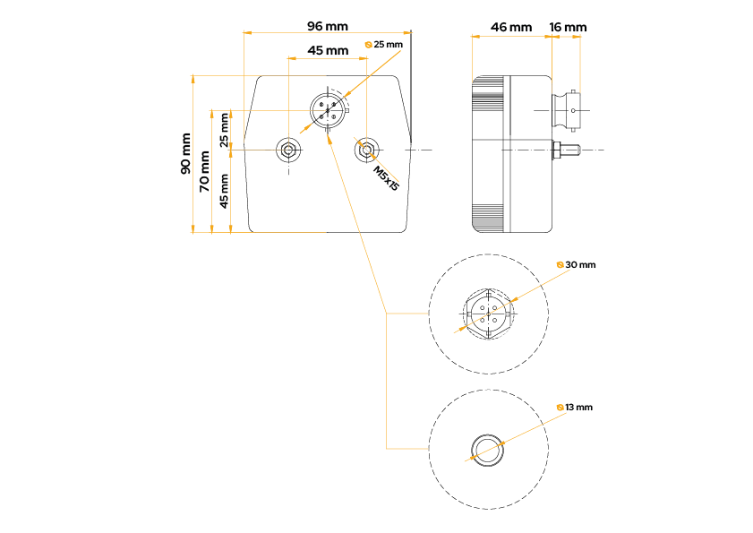 Il fanale posteriore MD-002 di FRISTOM è progettato per il montaggio sul lato sinistro e destro del veicolo ed è caratterizzato dalle seguenti dimensioni: larghezza 96 mm, altezza 90 mm, profondità 46 mm . Sul retro della lampada è presente un passacavo in gomma che facilita il collegamento del cavo, rendendola ideale per l'uso su rimorchi e furgoni .