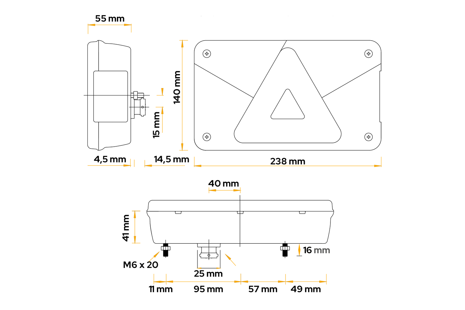 La lampada ha sei funzioni: luce di posizione , che assicura la visibilità del veicolo durante la guida notturna; luce di stop , segnalazione della frenata; indicatore di direzione , che consente di indicare l'intenzione di svoltare ; fendinebbia , che aumenta la sicurezza in condizioni meteorologiche difficili, come nebbia o forti piogge ; illuminazione della targa , che garantisce la visibilità del numero di targa del veicolo di notte ; e un triangolo riflettente che aumenta la visibilità del veicolo .