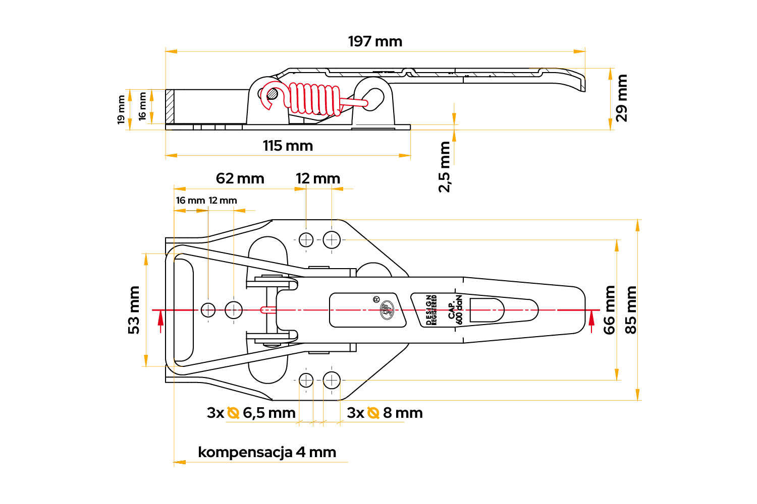 Il gancio di traino laterale STEELPRESS ZB-04 è un robusto componente hardware per rimorchi, progettato per fissare in modo sicuro e permanente le sponde di rimorchi da carico, agricoli e utilitari. Il gancio è lungo 197 mm e ha una capacità di carico fino a 600 kg , garantendone la durata anche in caso di utilizzo intensivo. Il design del gancio consente una compensazione fino a 4 mm , consentendo una regolazione flessibile a diverse configurazioni delle sponde, garantendo una chiusura stabile ed eliminando il rischio di apertura spontanea durante la guida .